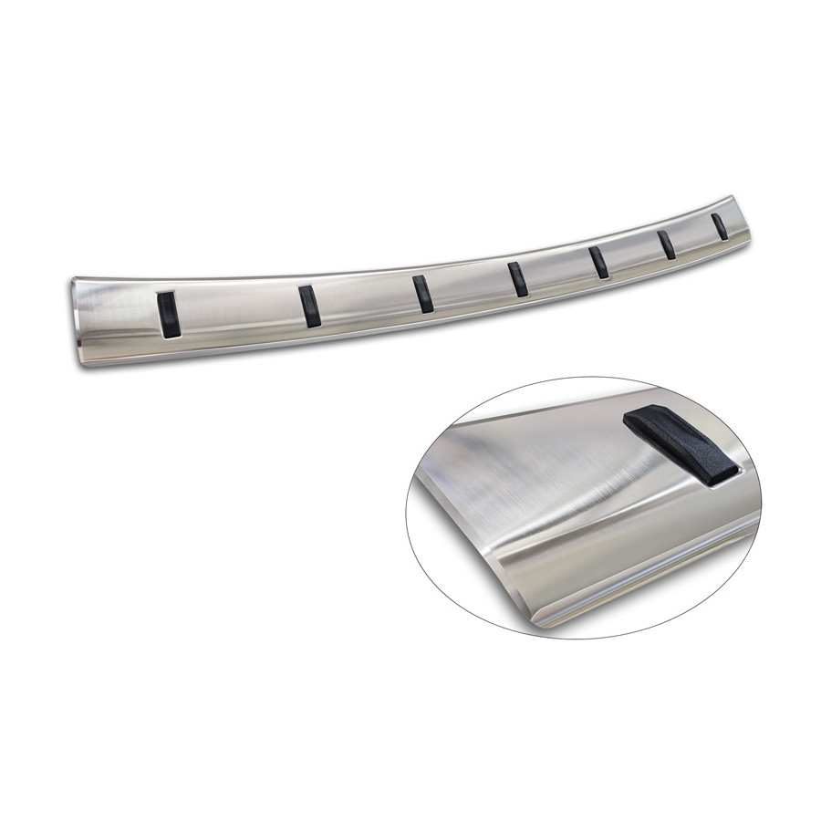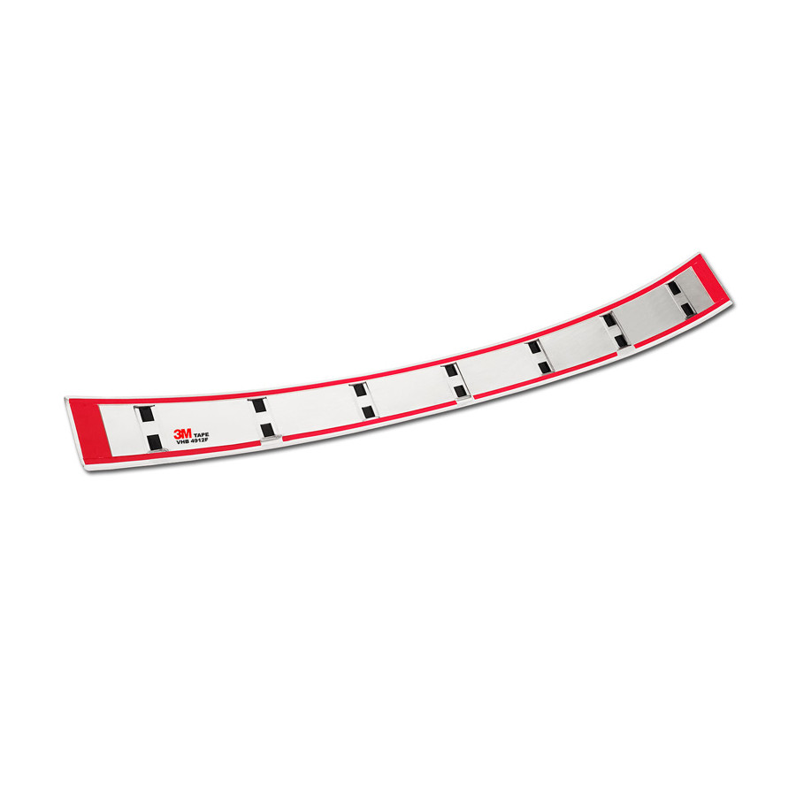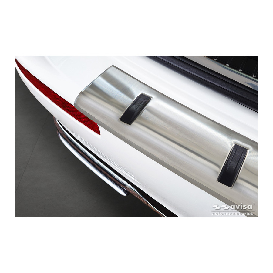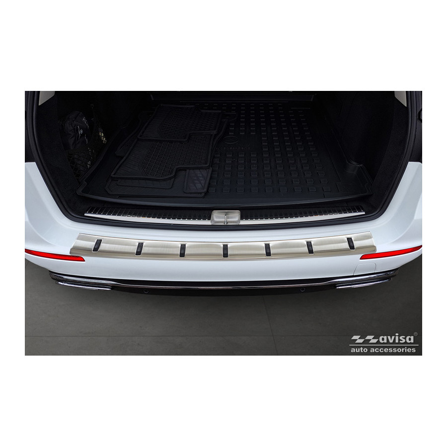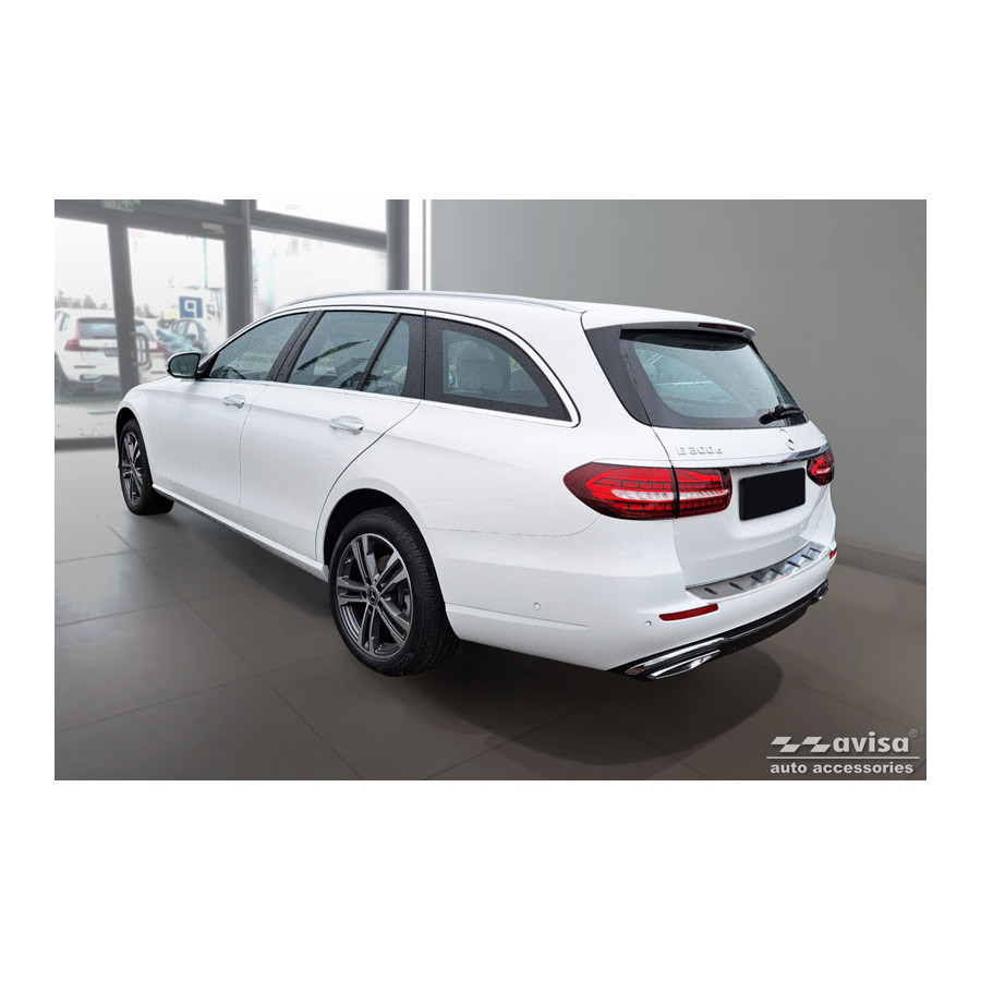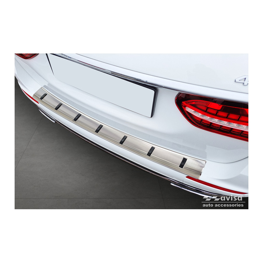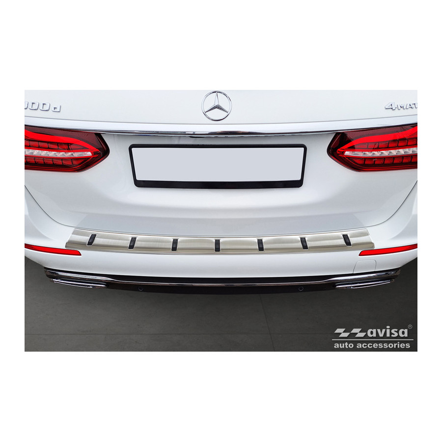 Stainless steel rear bumper protector suitable for Mercedes E-Class Estate S213 2016-2023 (incl. E53 AMG) 'STRONG EDITION'. Provide optimal protection against daily wear and tear on the top of your rear bumper. This part of the car is very susceptible to damage from loading and unloading. Repair and repainting costs are high, and the value of your car can decrease. With a rear bumper protector, you can prevent damage to the top of your rear bumper. These are custom-made for your car and conform to your car's bumper, resulting in a perfect fit. These protectors are very easy to install. They are attached with double-sided 3M tape, which will not damage the original paint. This is included in the package, along with full schematic mounting instructions. Installation takes approximately 10 minutes. A primer is included for some rear bumper protectors that are attached directly to unpainted bumpers. The primer strengthens the strength of the 3M tape.