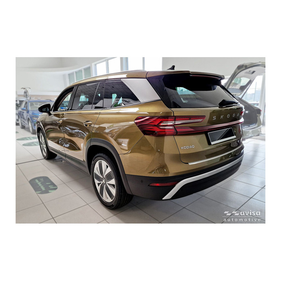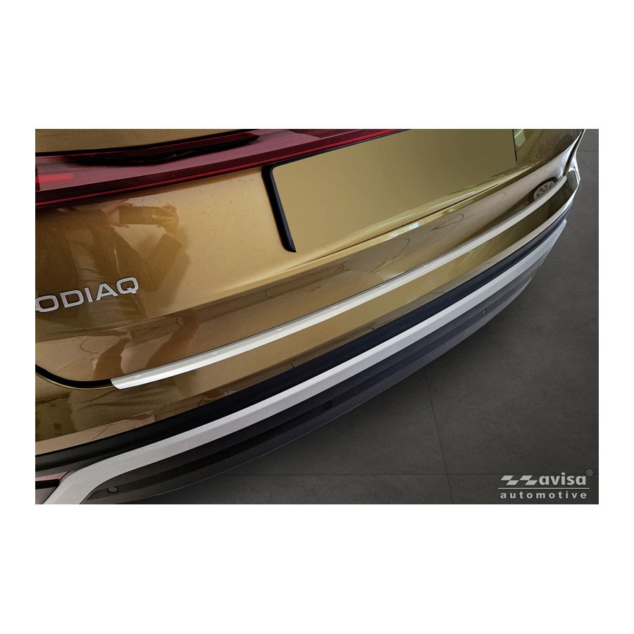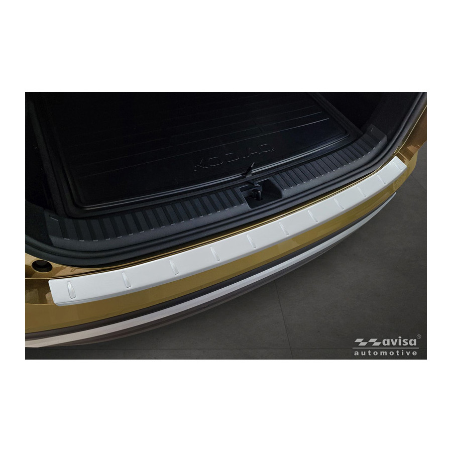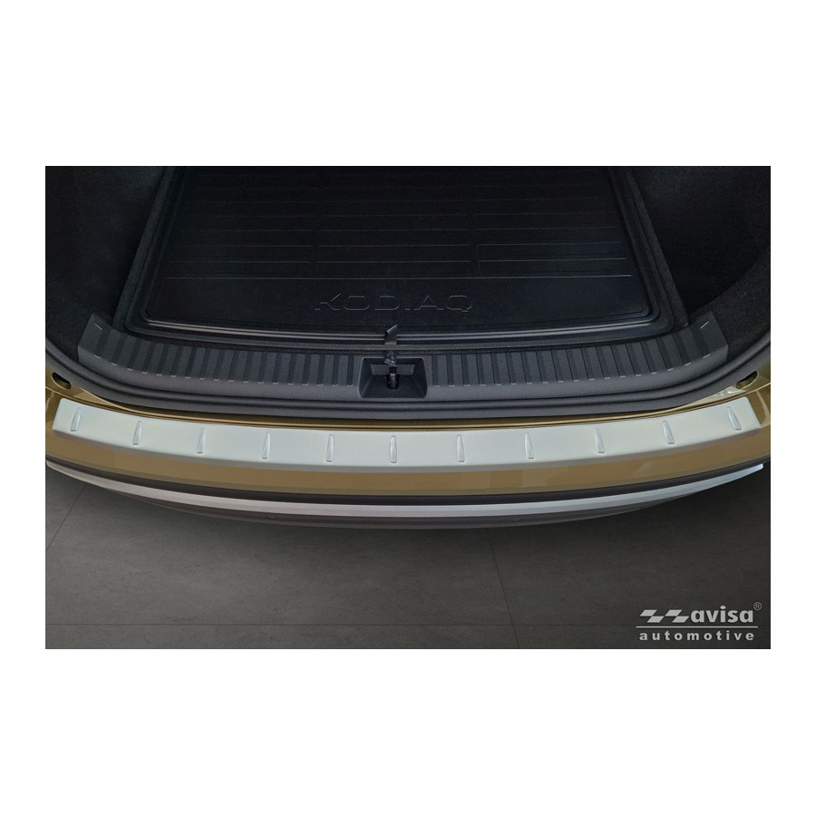 Stainless steel powder-coated rear bumper protector suitable for Skoda Kodiaq II 2024- 'Soft Silver'. Provide optimal protection against daily wear and tear on the top of your rear bumper. This part of the car is very susceptible to damage from loading and unloading. Repair and repainting costs are high, and the value of your car can decrease. With a rear bumper protector, you can prevent damage to the top of your rear bumper. These are custom-made for your car and conform to your bumper, resulting in a perfect fit. These protectors are very easy to install. They are attached with double-sided 3M tape, which will not damage the original paint. This is included in the package, as are full schematic installation instructions. Installation takes approximately 10 minutes.