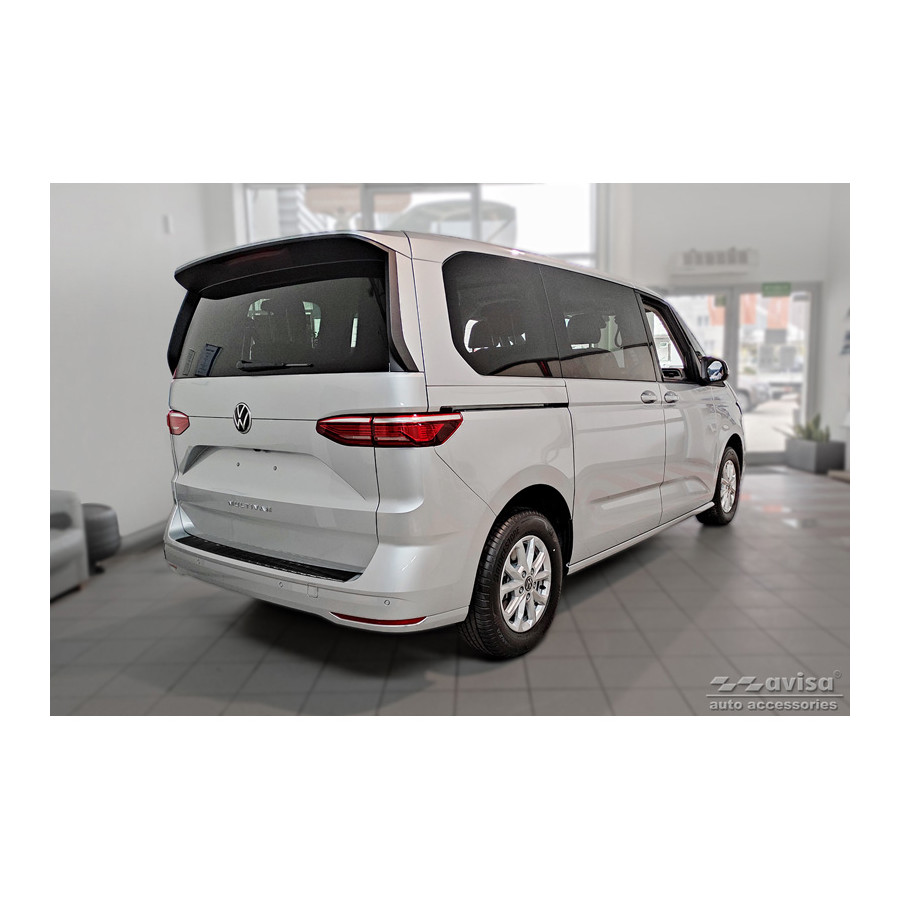 Black-Chrome Stainless Steel Rear Bumper Protector for the Volkswagen Multivan T7 2021 - 'Ribs'. Provide optimal protection against daily wear and tear on the top of the rear bumper. This part of the car is particularly susceptible to damage from loading and unloading. Repair and repainting costs are high, and the value of your car can decrease.