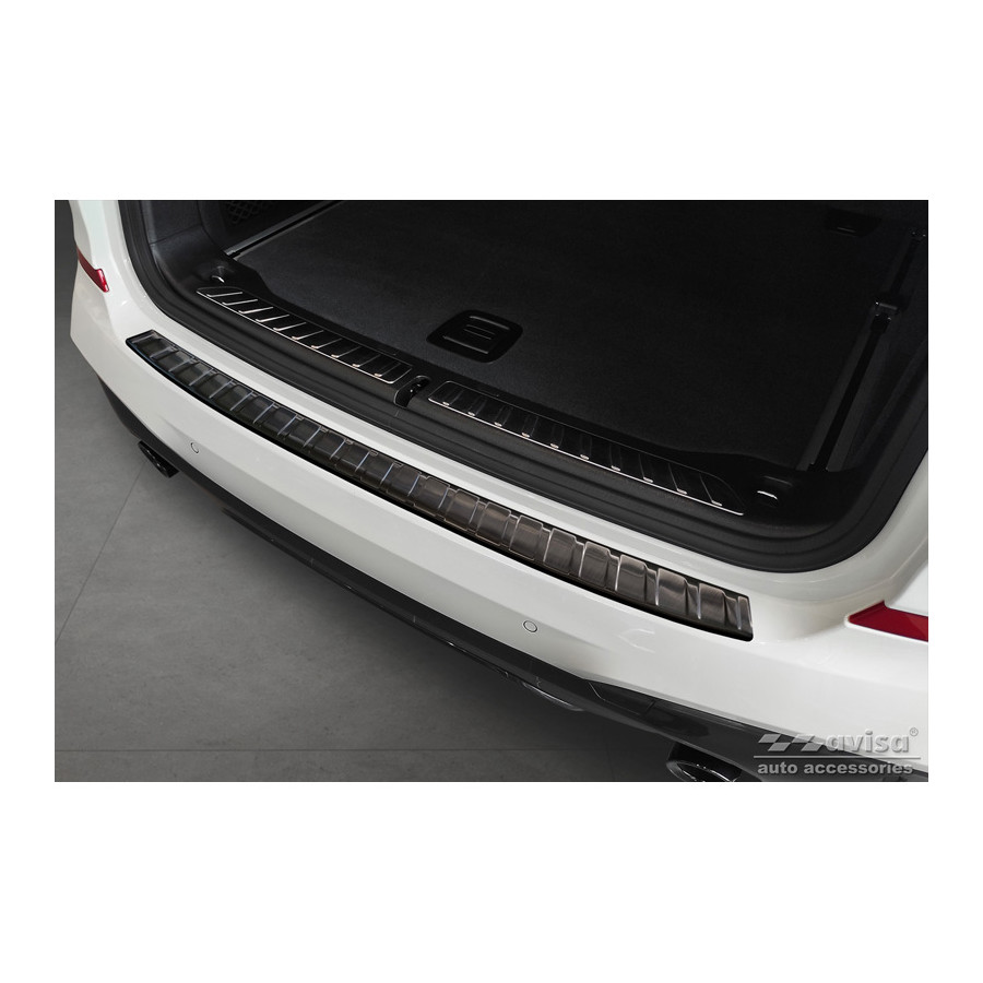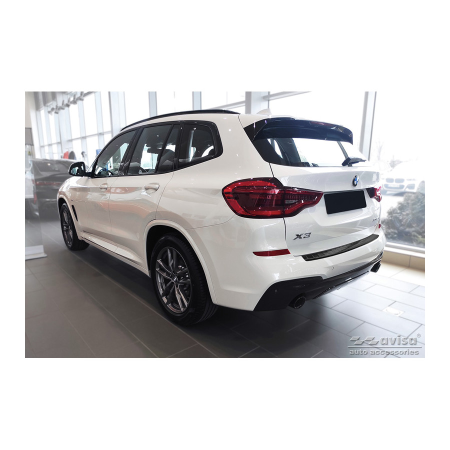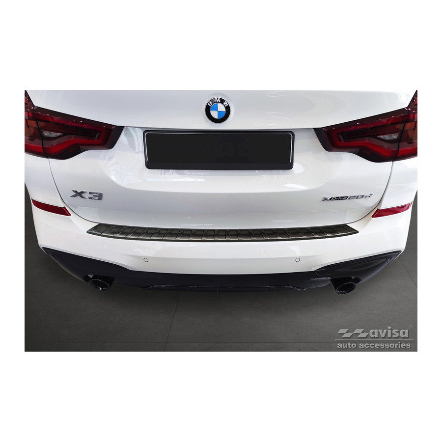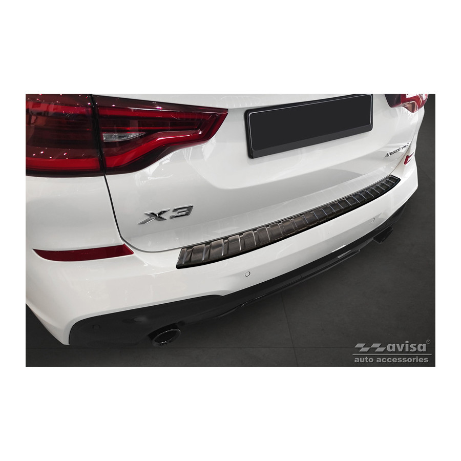 Black Stainless Steel Rear Bumper Protector suitable for BMW X3 G01 M-Package 2017-2021 & Facelift 2021- Incl. M Competition 2019-2021 'Ribs'Provide optimal protection against daily wear and tear on the top of the rear bumper. This part of the car is very sensitive to damage from loading and unloading items. The costs for repairs and respraying are high, and the value of your car can decrease.