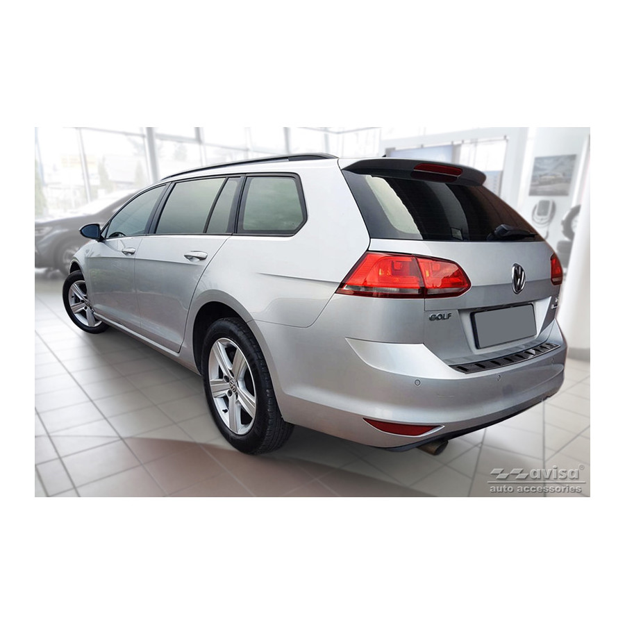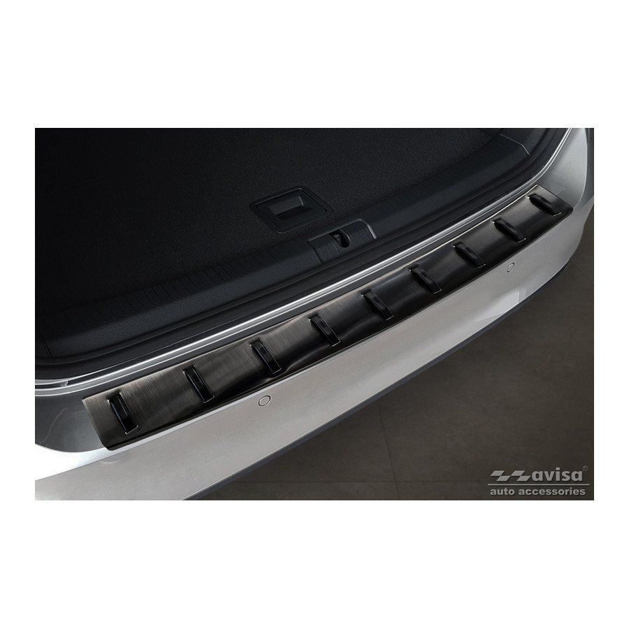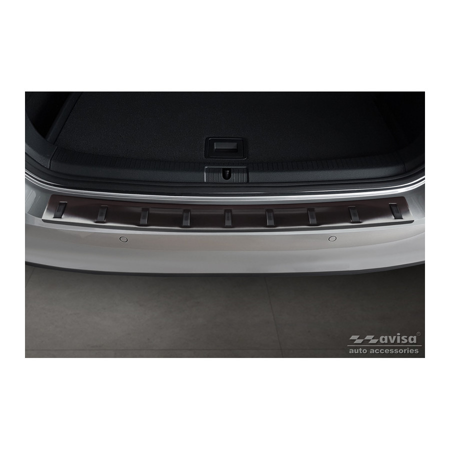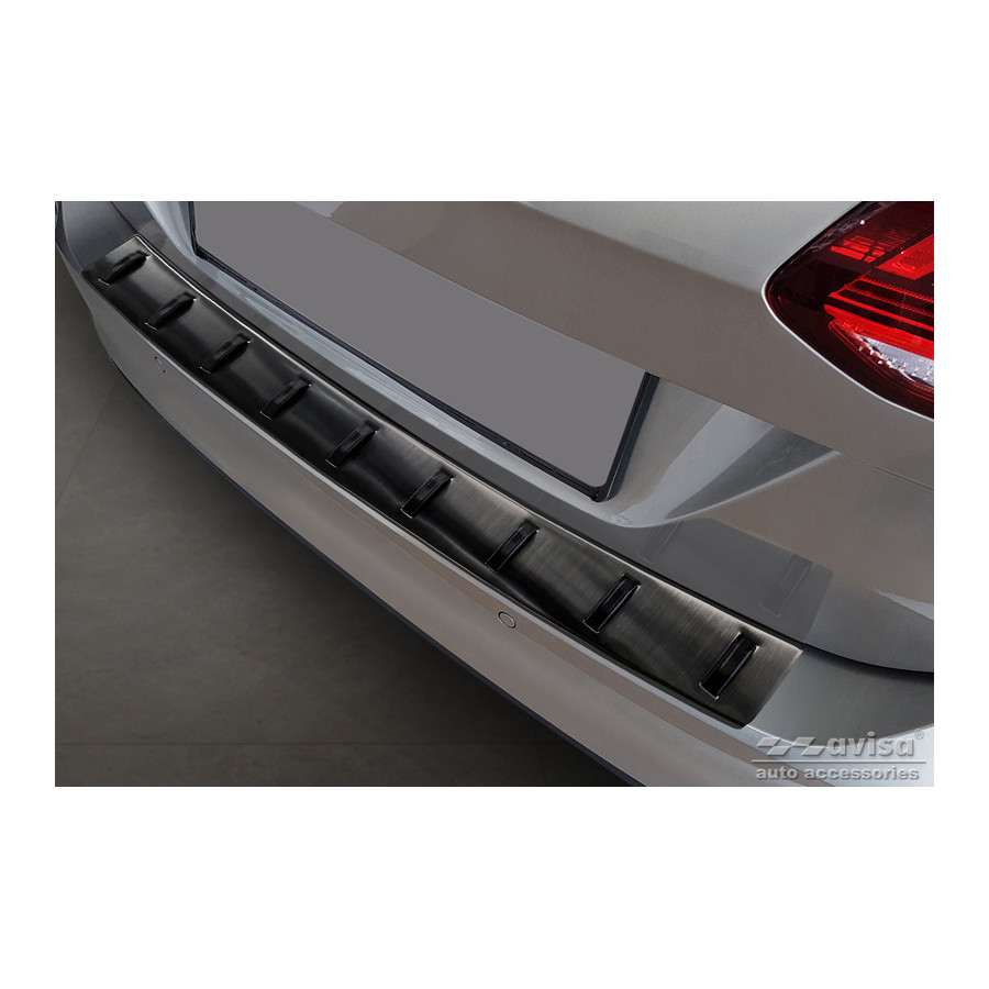 Black stainless steel rear bumper protector suitable for Volkswagen Golf VII Variant incl. Alltrack 2012-2017 'STRONG EDITION'. Provide optimal protection against daily wear and tear on the top of your rear bumper. This part of the car is very susceptible to damage from loading and unloading. Repair and respray costs are high, and the value of your car can decrease. With a rear bumper protector, you can prevent damage to the top of your rear bumper. These are custom-made for your car and conform to your bumper, resulting in a perfect fit. Material: The Avisa 'STRONG EDITION' protectors are made of stainless steel combined with hardened polyurethane ribs, which not only provides protection but also gives your car a stylish appearance. The material is sturdy, durable, and weatherproof. This means the protector will last for years. With over 30 years of experience, Avisa is a leader in the design and production of these protectors. These are available in various colors and styles. Installation: These protectors are very easy to install. They are attached using double-sided 3M tape, which will not damage the original paint. This is included in the package, along with complete schematic installation instructions. Installation takes approximately 10 minutes. For a selection of rear bumper protectors that are attached directly to unpainted bumpers, a primer is included. The primer enhances the adhesive strength of the 3M tape.