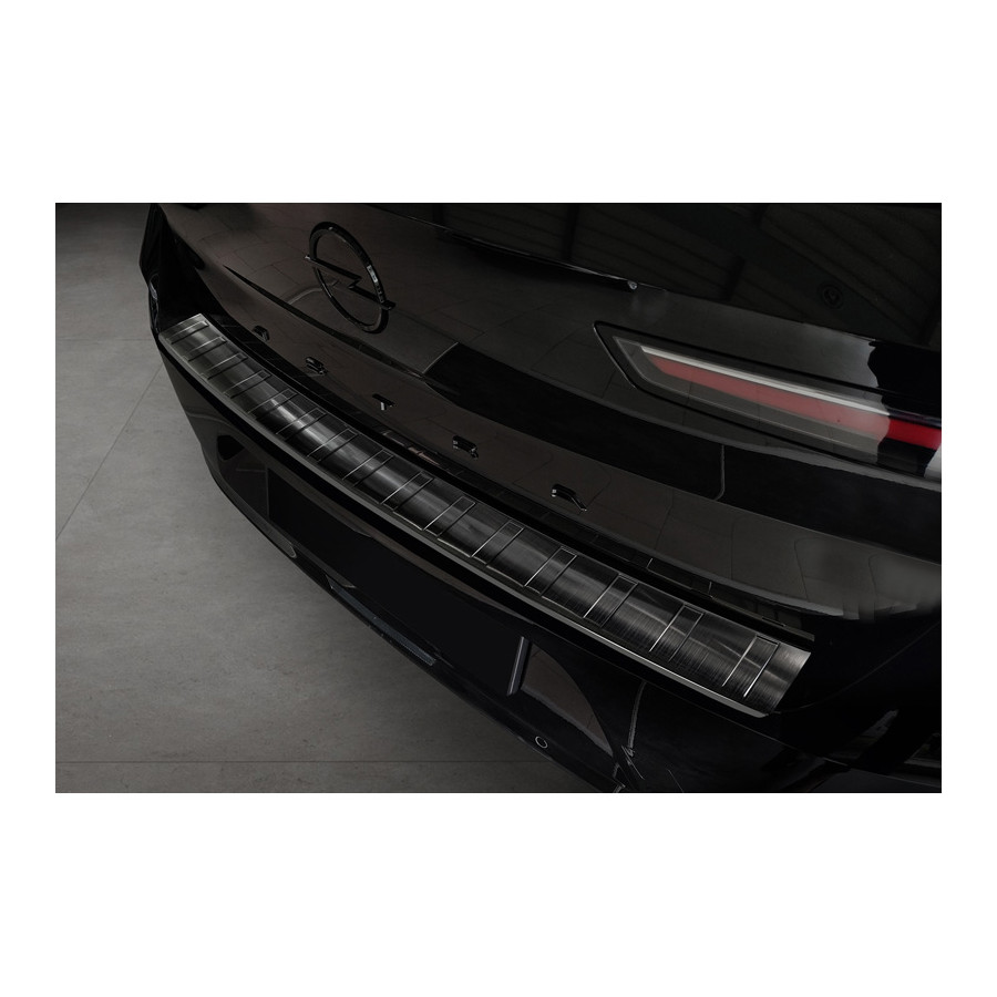 Black stainless steel rear bumper protector suitable for Opel Astra L HB 5-door 2021- 'Ribs'. Provide optimal protection against daily wear and tear on the top of the rear bumper. This part of the car is particularly susceptible to damage from loading and unloading. Repair and repainting costs are high, and the value of your car can decrease.