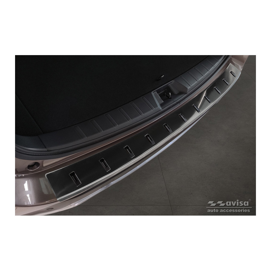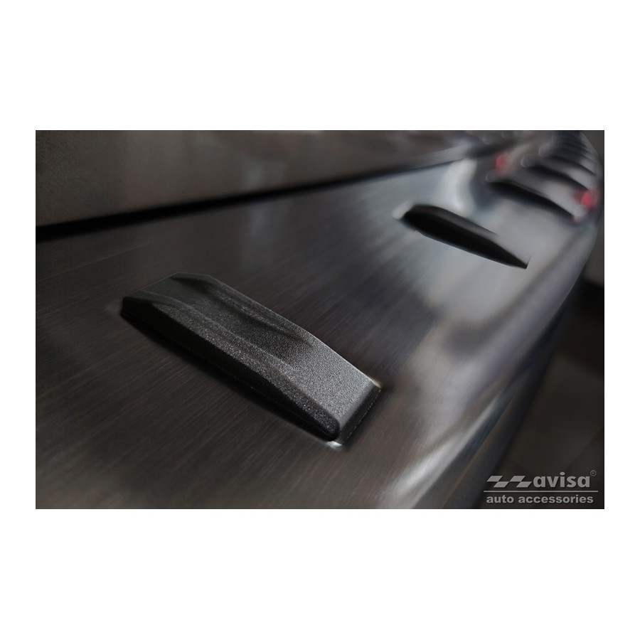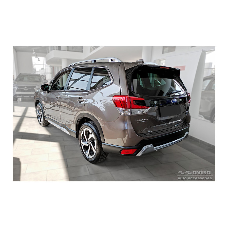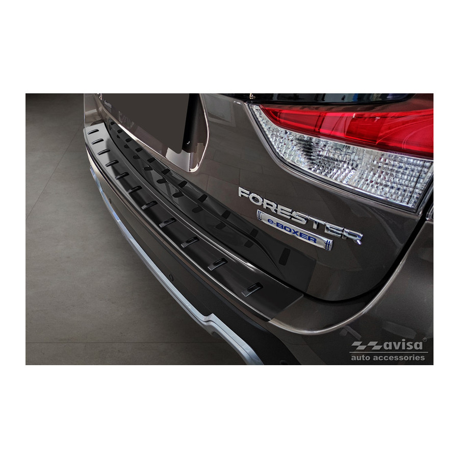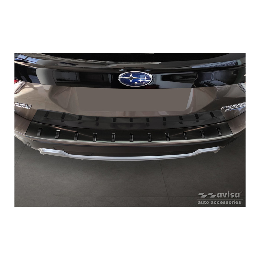 Black Stainless Steel Rear Bumper Protector suitable for Subaru Forester (SK) 2018- 'STRONG EDITION'. Provide optimal protection against daily wear and tear on the top of your rear bumper. This part of the car is very susceptible to damage from loading and unloading. Repair and repainting costs are high, and the value of your car can decrease. With a rear bumper protector, you can prevent damage to the top of your rear bumper. These are custom-made for your car and conform to your bumper, resulting in a perfect fit. Material: The Avisa 'STRONG EDITION' protectors are made of stainless steel combined with hardened polyurethane ribs, which not only provides protection but also gives your car a stylish appearance. The material is sturdy, durable, and weatherproof. This ensures the protector will last for years. With over 30 years of experience, Avisa is a leader in the design and production of these protectors. These are available in various colors and styles. Installation: These protectors are very easy to install. They are attached using double-sided 3M tape, which will not damage the original paint. This is included in the package, along with complete schematic installation instructions. Installation takes approximately 10 minutes. For a selection of rear bumper protectors that are attached directly to unpainted bumpers, a primer is included. The primer enhances the adhesive strength of the 3M tape.