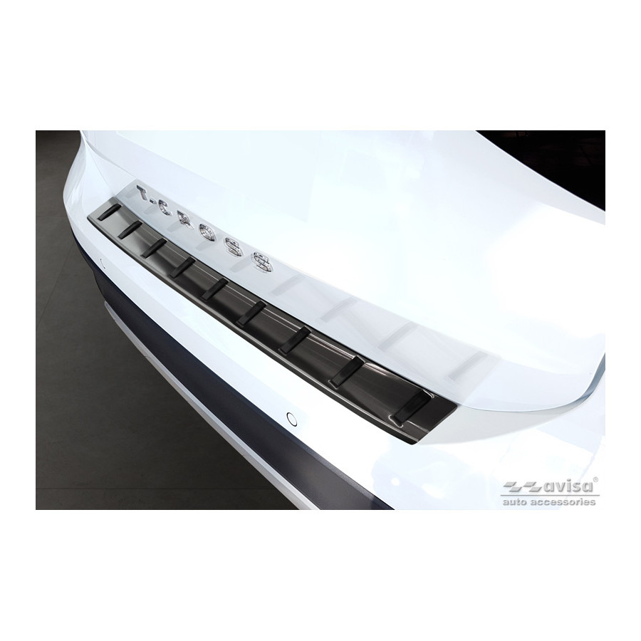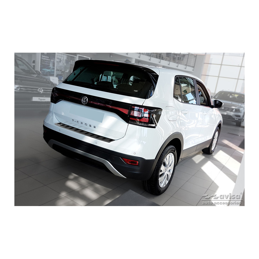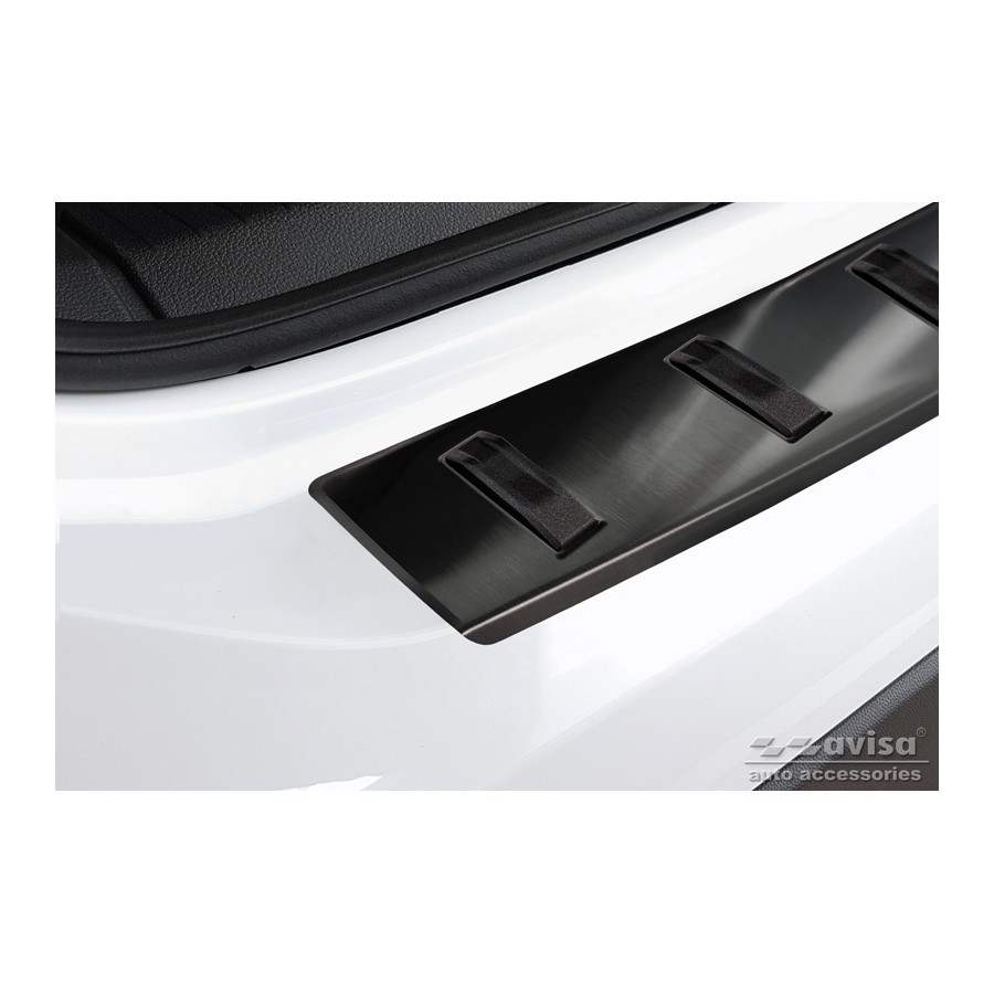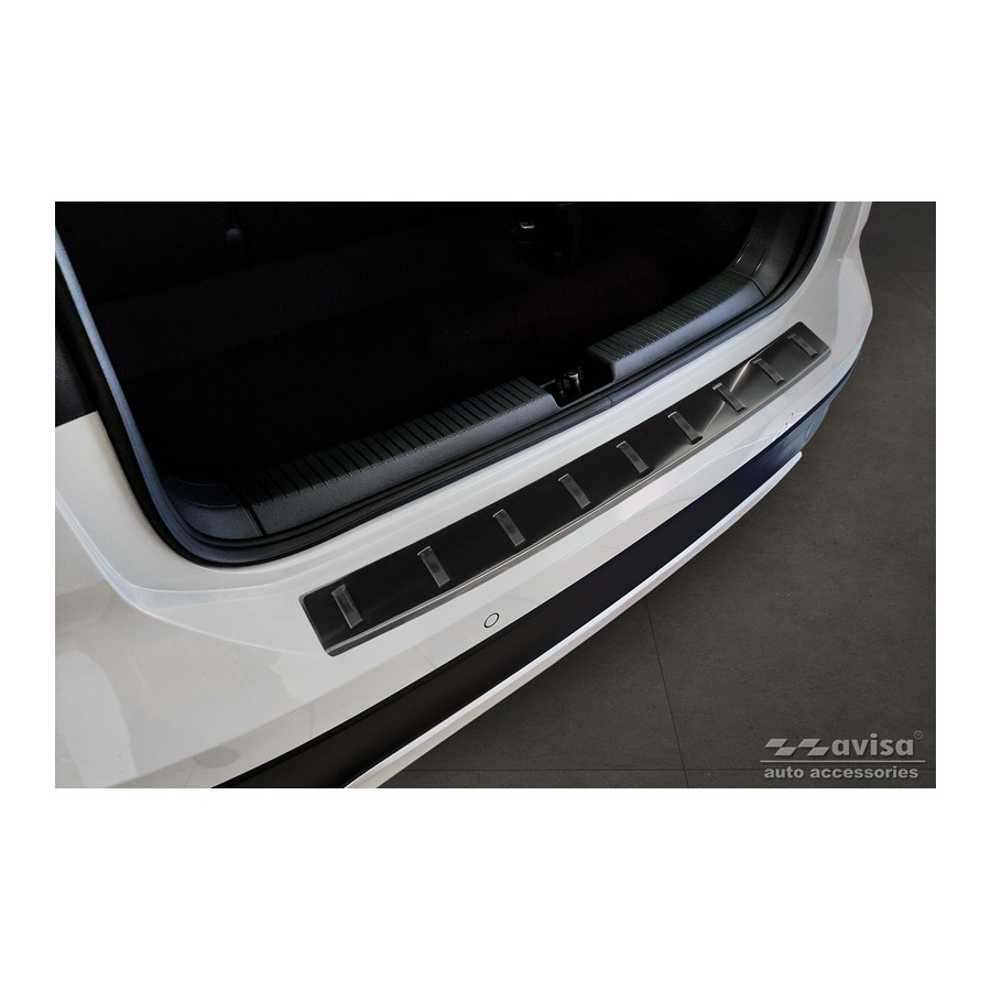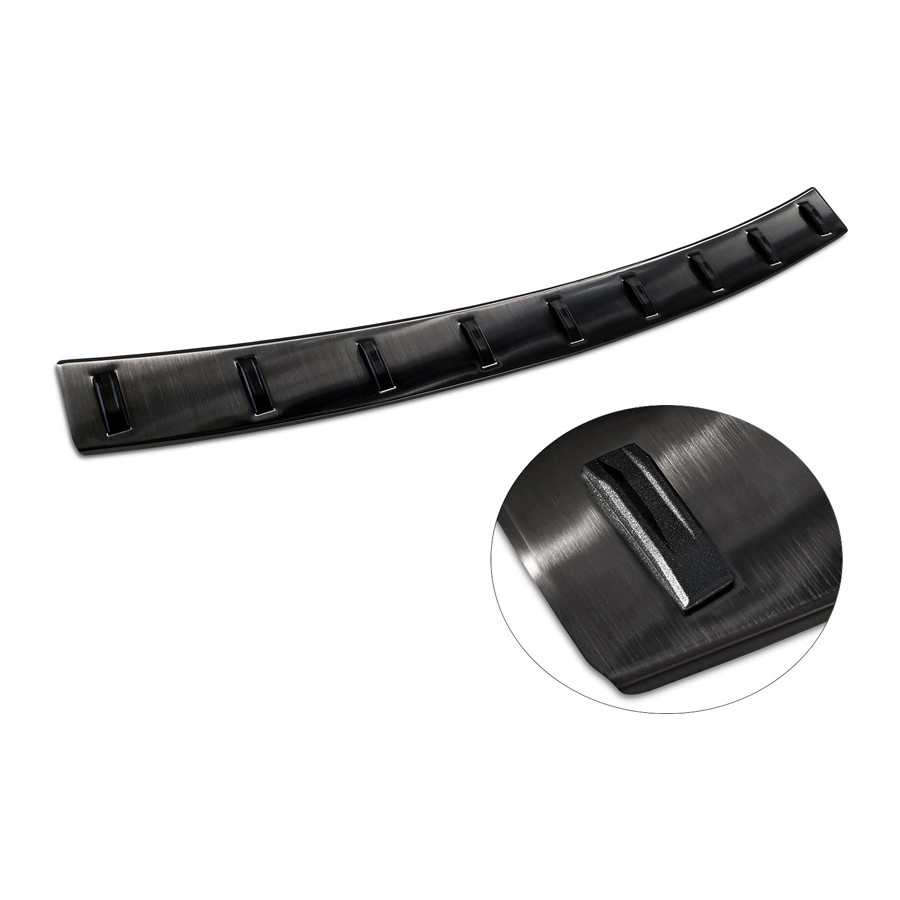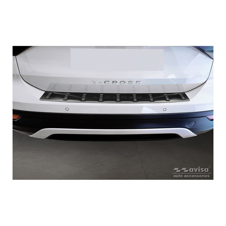 Black stainless steel rear bumper protector suitable for the Volkswagen T-Cross 2019- 'STRONG EDITION'. Provides optimal protection against daily wear and tear on the top of the rear bumper. This part of the car is particularly susceptible to damage from loading and unloading. Repair and repainting costs are high, and the value of your car can decrease.