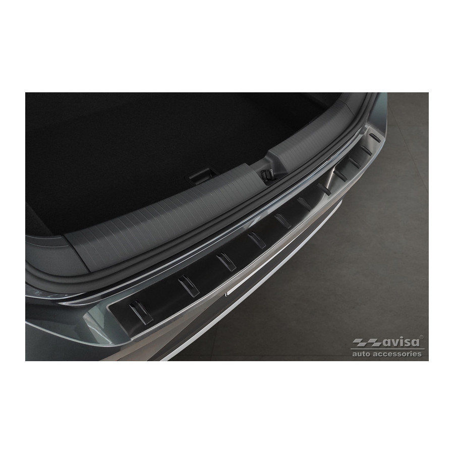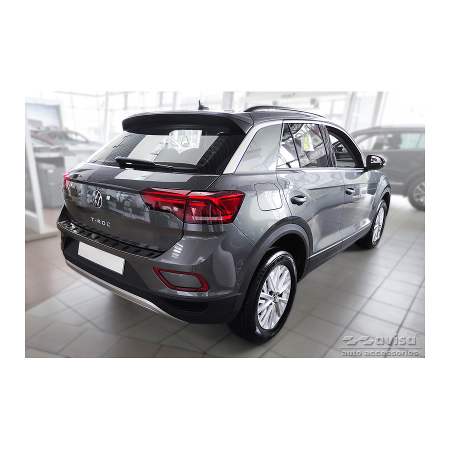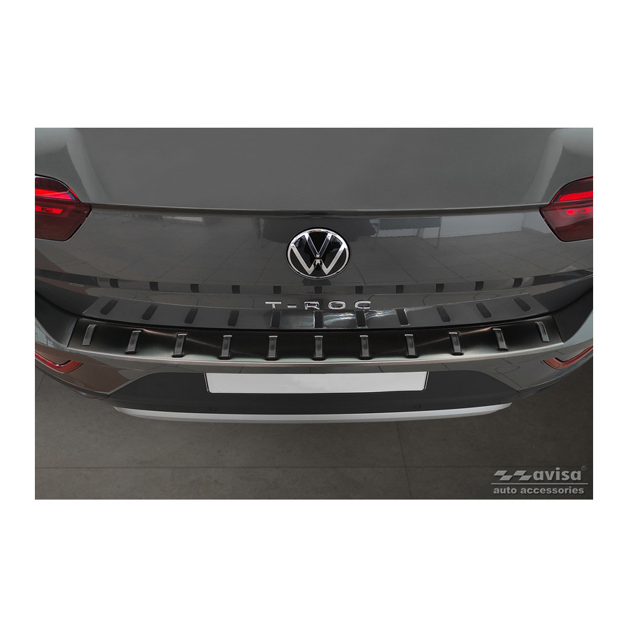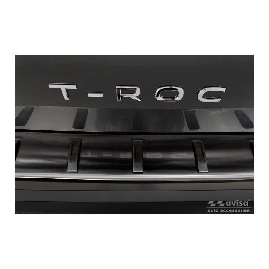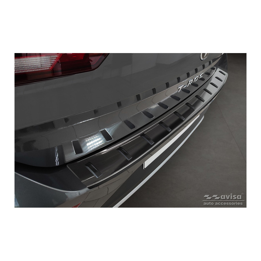 Black stainless steel rear bumper protector suitable for Volkswagen T-Roc & T-Roc Cabrio 2017-2022 & Facelift 2022- 'STRONG EDITION'. Provide optimal protection against daily wear and tear on the top of your rear bumper. This part of the car is very susceptible to damage from loading and unloading. Repair and respray costs are high, and the value of your car can decrease. With a rear bumper protector, you can prevent damage to the top of your rear bumper. These are custom-made for your car and conform to your bumper, resulting in a perfect fit. Material: The Avisa 'STRONG EDITION' protectors are made of stainless steel combined with hardened polyurethane ribs, which not only provides protection but also gives your car a stylish look. The material is sturdy, durable, and resistant to all weather conditions. This ensures the molding will last for years. With over 30 years of experience, Avisa is a leader in the design and production of these moldings. They are available in various colors and styles. Installation: These moldings are very easy to install. They are attached using double-sided 3M tape, which will not damage the original paint. This is included in the package, along with complete schematic installation instructions. Installation takes approximately 10 minutes. For a selection of rear bumper protectors that are attached directly to unpainted bumpers, a primer is included. The primer enhances the strength of the 3M tape.