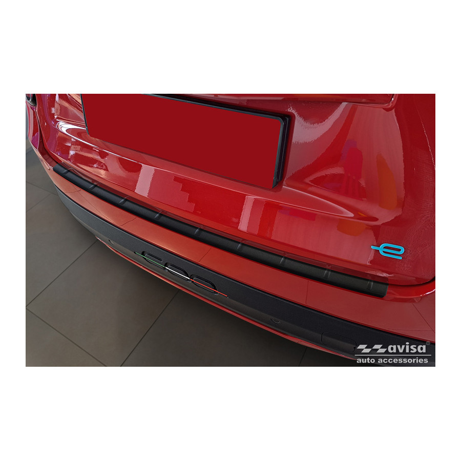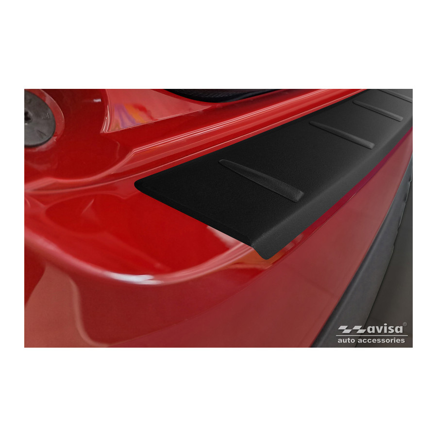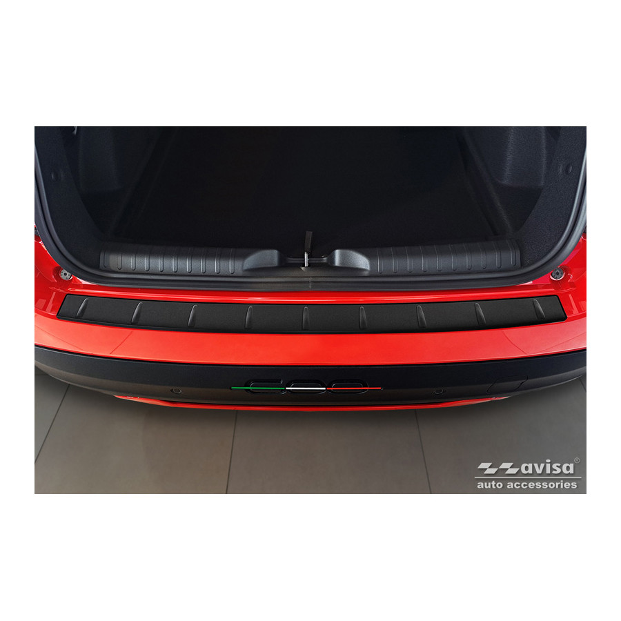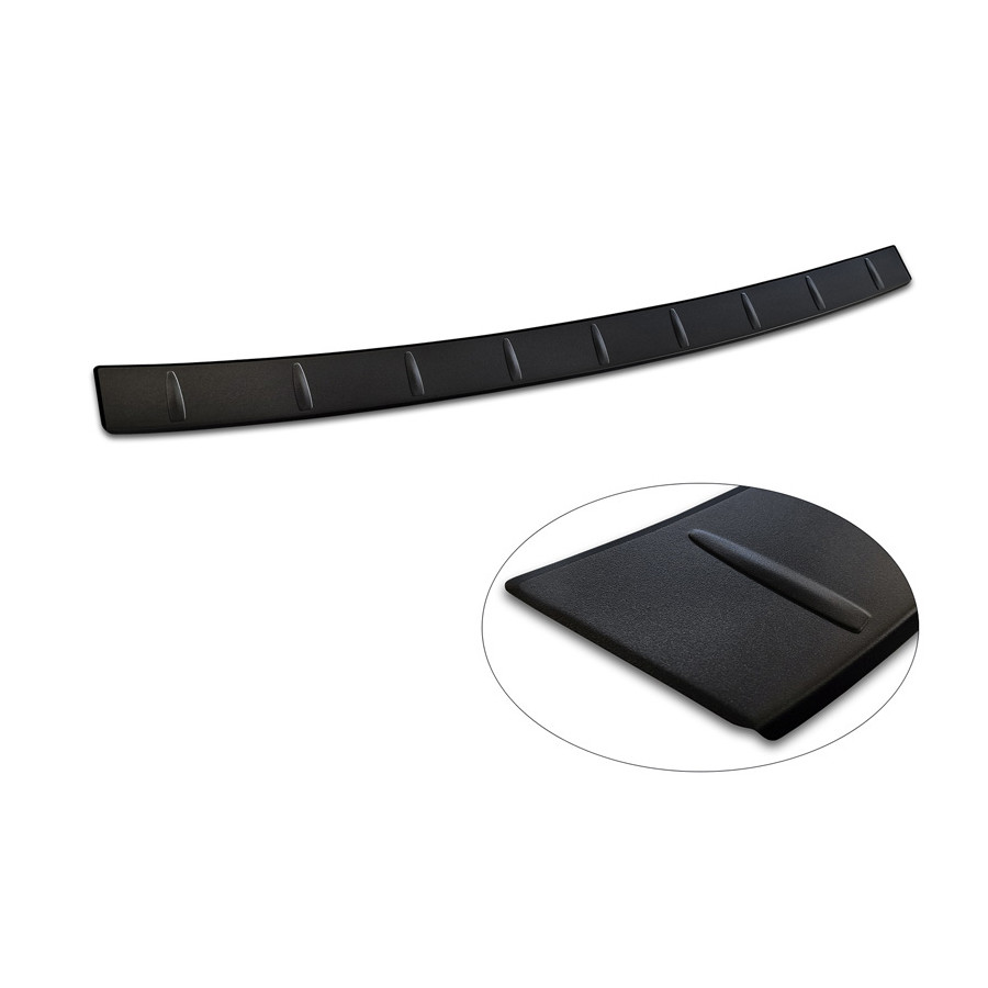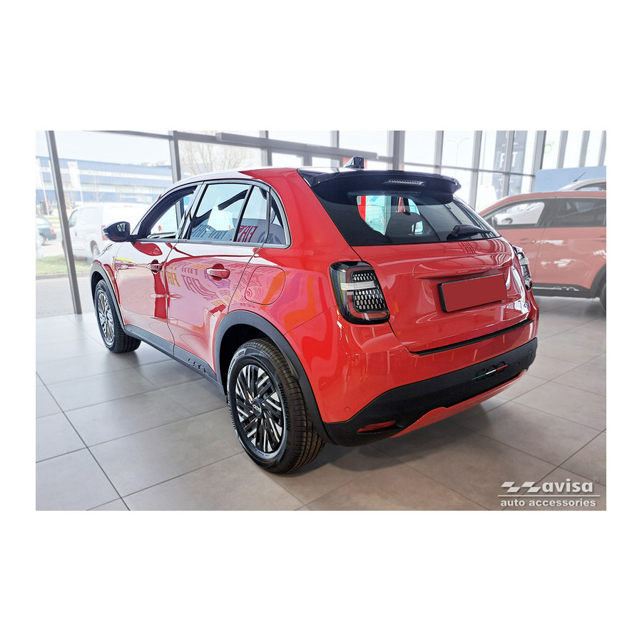 Matte black stainless steel rear bumper protector suitable for Fiat 600 Mild Hybrid / 600e 2023- 'Ribs'. Provide optimal protection against daily wear and tear on the top of the rear bumper. This part of the car is particularly susceptible to damage from loading and unloading. Repair and repainting costs are high, and the value of your car can decrease.