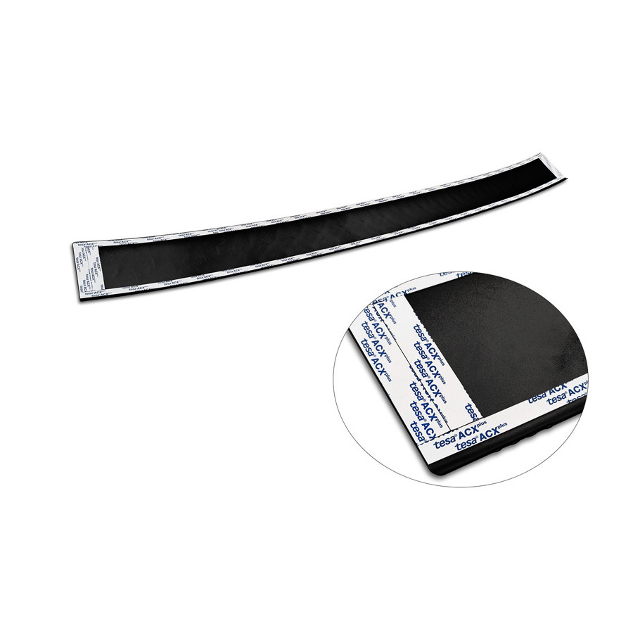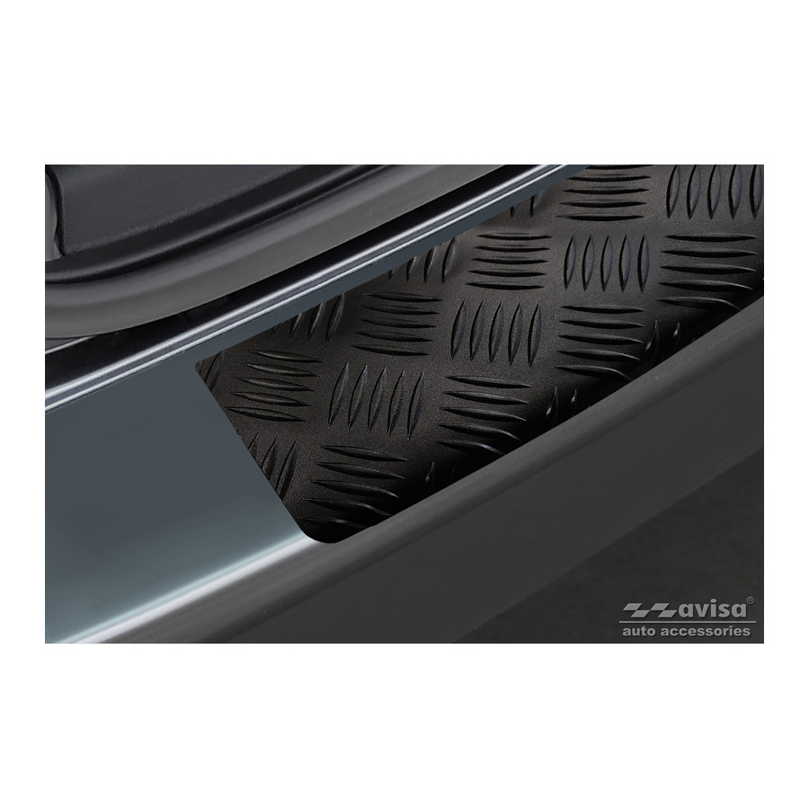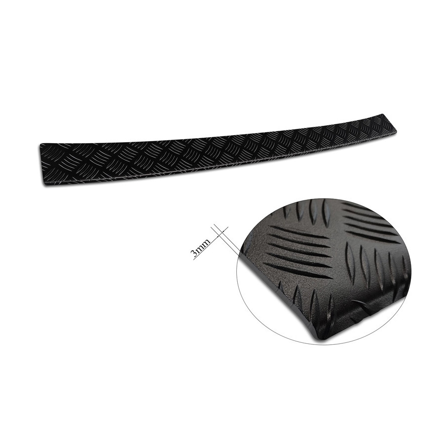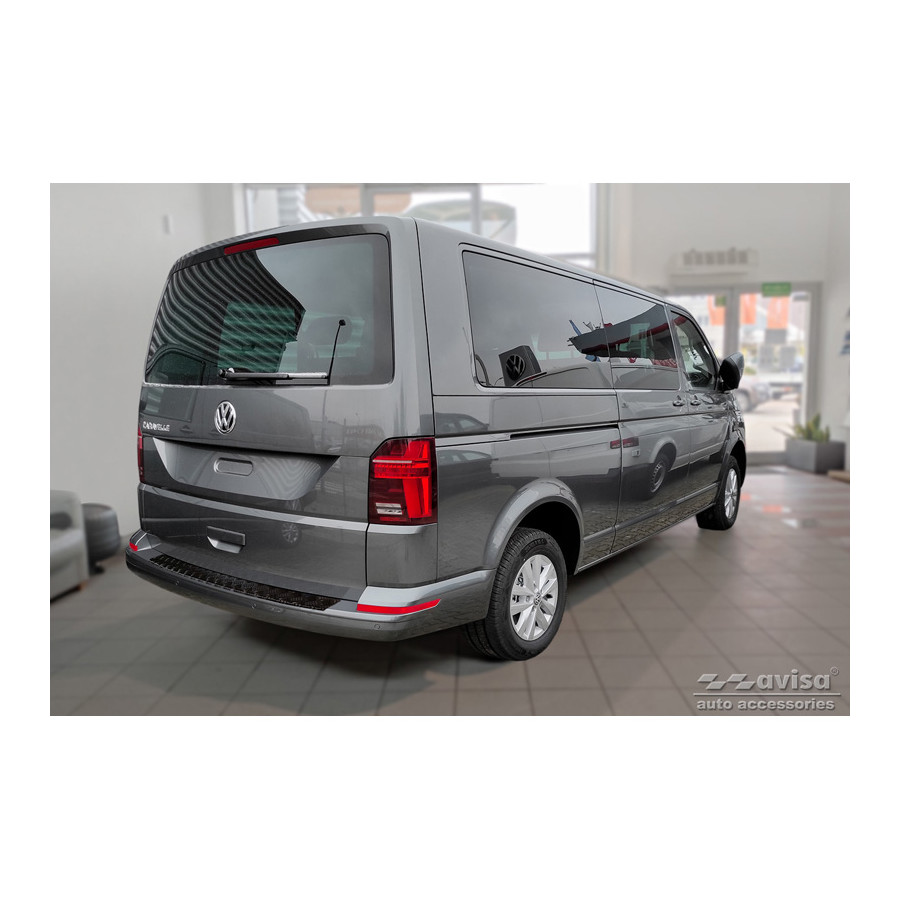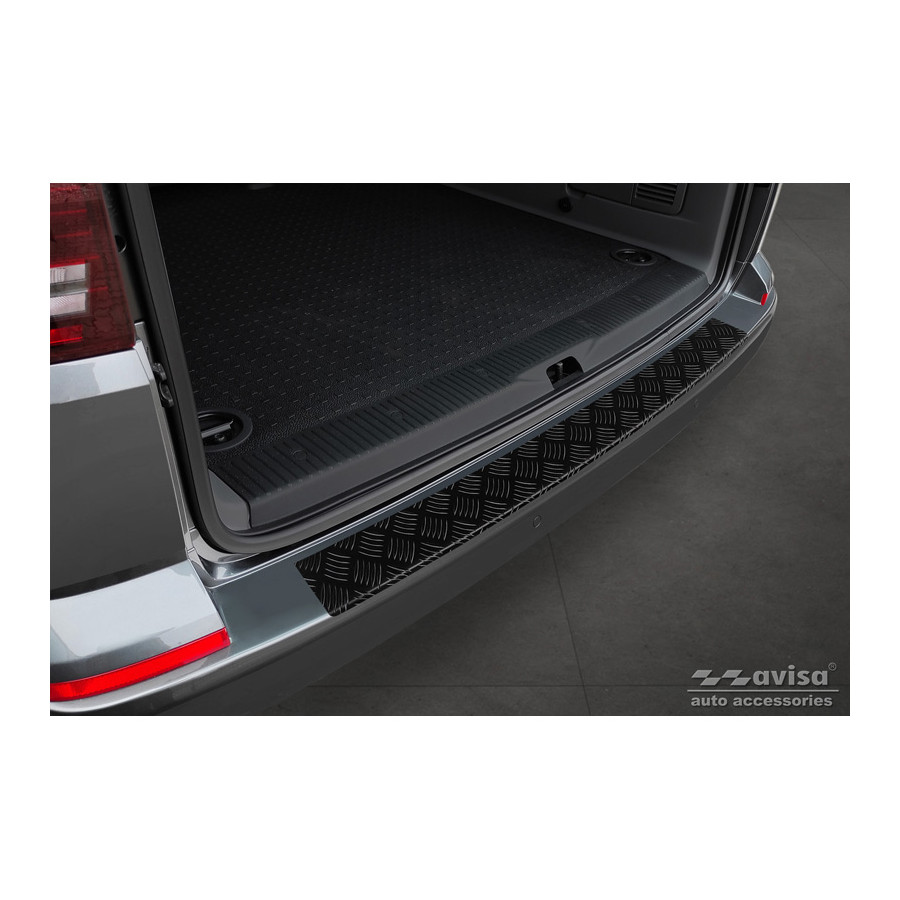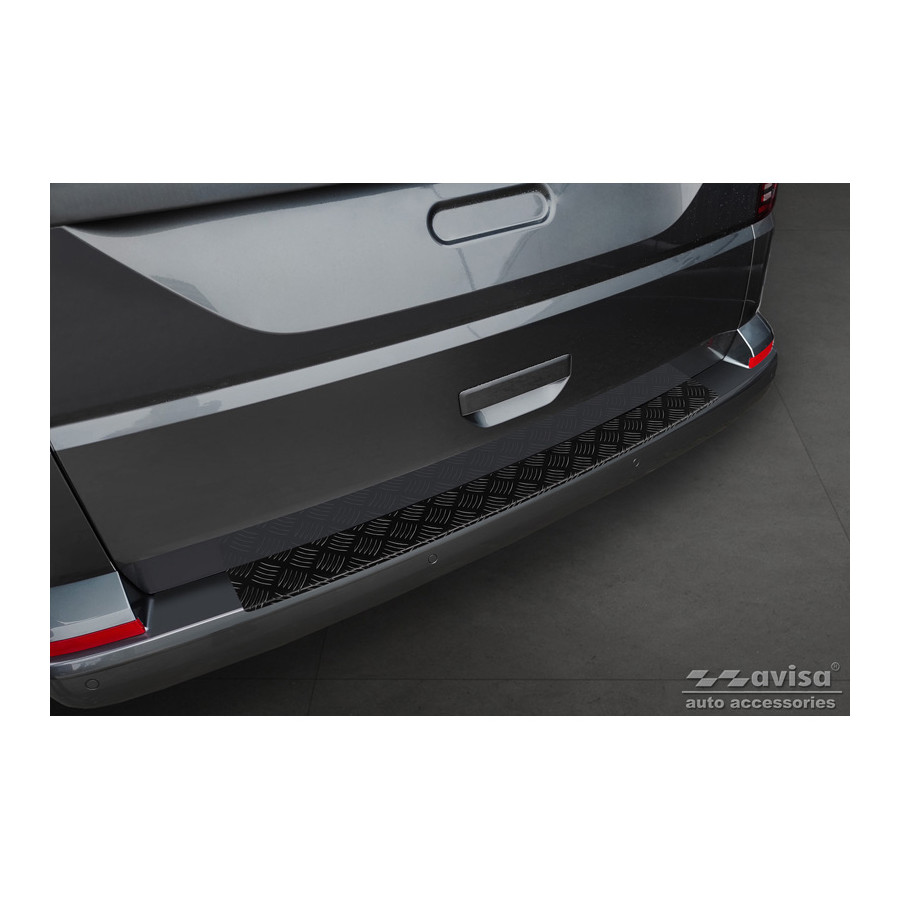 Matte Black Aluminum Rear Bumper Protector suitable for Volkswagen Transporter T6 2015- & FL 2019- (with tailgate) 'Riffled plate'. Provides optimal protection against daily wear and tear on the top of the rear bumper. This part of the car is particularly susceptible to damage from loading and unloading. Repair and repainting costs are high, and the value of your car can decrease. With a rear bumper protector, you can prevent damage to the top of your rear bumper. These are custom-made for your car and conform to your bumper, resulting in a perfect fit. Material: This Avisa protector is made of aluminum, which not only provides protection but also gives your car a stylish look. The material is sturdy, lightweight, and rust-resistant, ensuring years of durability. With over 30 years of experience, Avisa is a leader in the design and production of these protectors. They are available in various colors and styles. Installation: These protectors are very easy to install. They are attached with double-sided 3M tape, which will not damage the original paint. This is included in the package, along with full schematic installation instructions. Installation takes approximately 10 minutes.