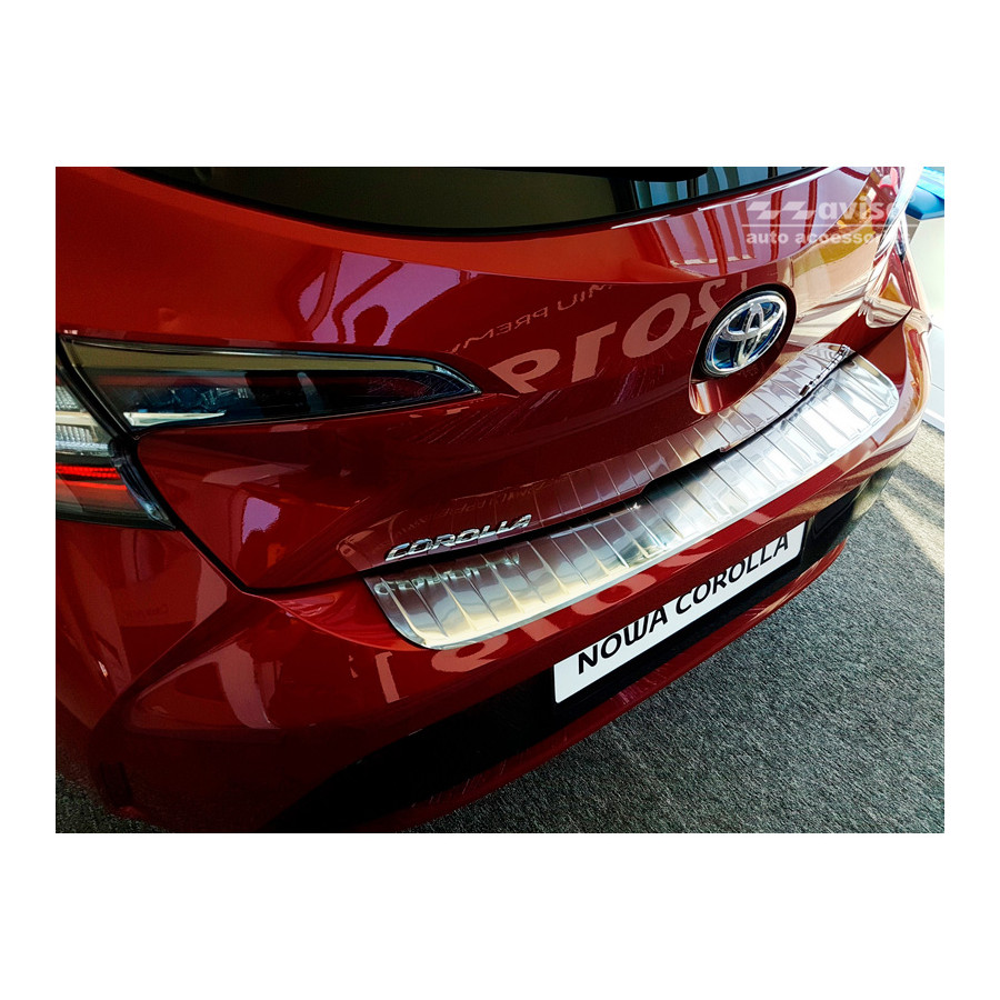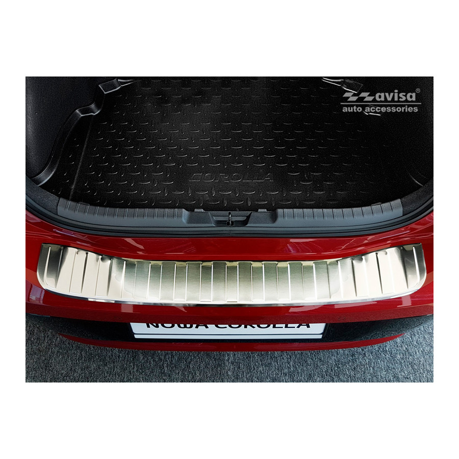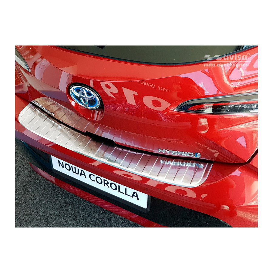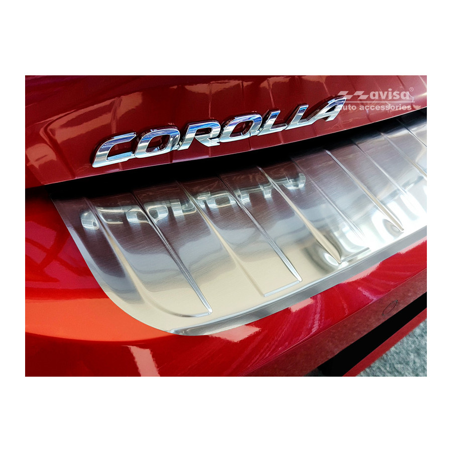 Toyota Corolla XII HB 2019- Stainless steel rear bumper protector prevents damage to your car. Most cars are equipped with a painted rear bumper molding. For example, if you load items into the car, the top of the rear bumper is easily scratched. The rear bumper is very sensitive to damage and the costs for repairs and respraying are high.