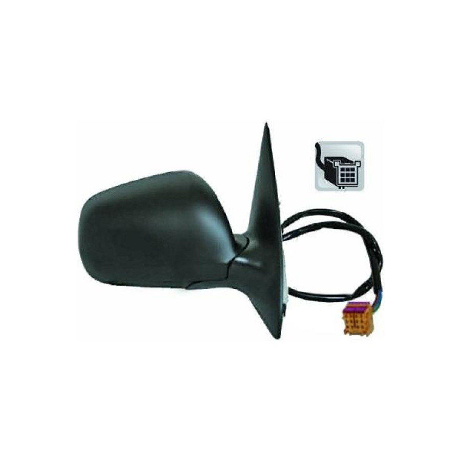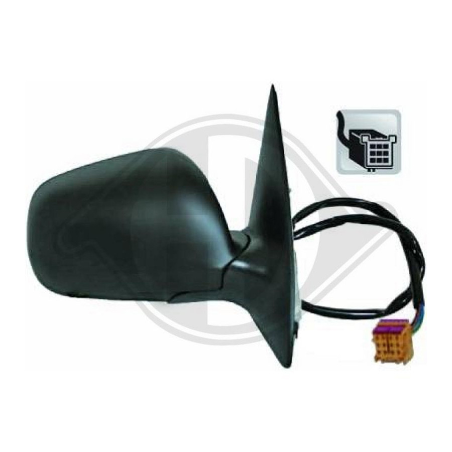 Fitting Position Right (driver's side) Surface Primed Outer/Inner Mirror For electric mirror adjustment Heatable Small mirror housing Complete Mirror Spherical Registration Type ECE tested Connector Shape Angular Warranty 2 years Number of contacts 5 -