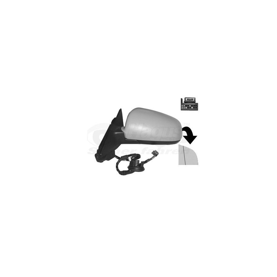 Fitting Position Left (passenger side) Surface Primed Outer/Inner Mirror Spherical Electronically foldable Heatable Complete Mirror For electric mirror adjustment Paired article numbers 0333820 Number of connectors 1 Number of Doors 5 Quality Hagus Number of used contacts 7 Warranty 3 years Number of contacts 16 Similar products of other manufacturers