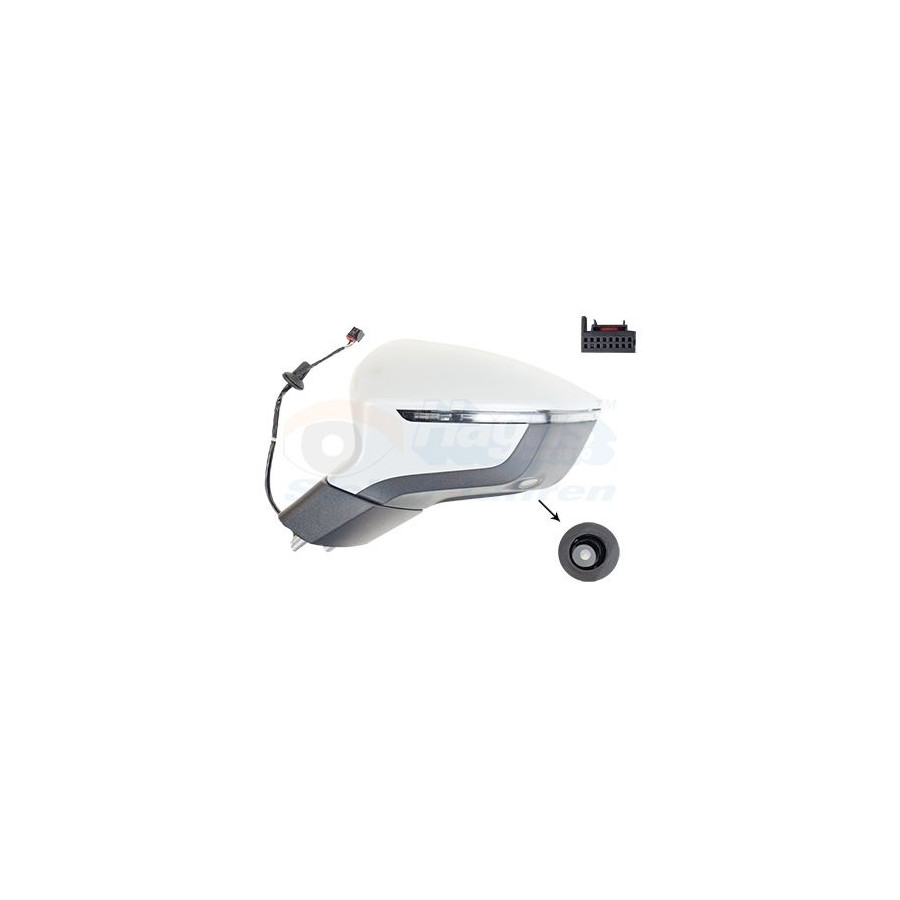 Fitting Position Left (passenger side) Colour Black Surface Primed Outer/Inner Mirror Complete Mirror Spherical For electric mirror adjustment Electronically foldable Heatable Paired article numbers 4907826 Number of connectors 1 Quality Hagus Light Distribution Surface Lighting Number of used contacts 9 Warranty 2 years Number of contacts 16 -