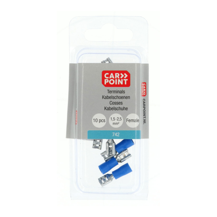 Blue Carpoint partially insulated flat plug sleeve 742. Flat plug cable lugs are suitable for a wire cross-section of 1.5–2.5 mm². The size of the flat plug is 4.8 x 0.5 mm. Flat plugs are inserted into flat receptacles. These connection types are found on certain components and can be connected to cable lugs using the appropriate mating piece.