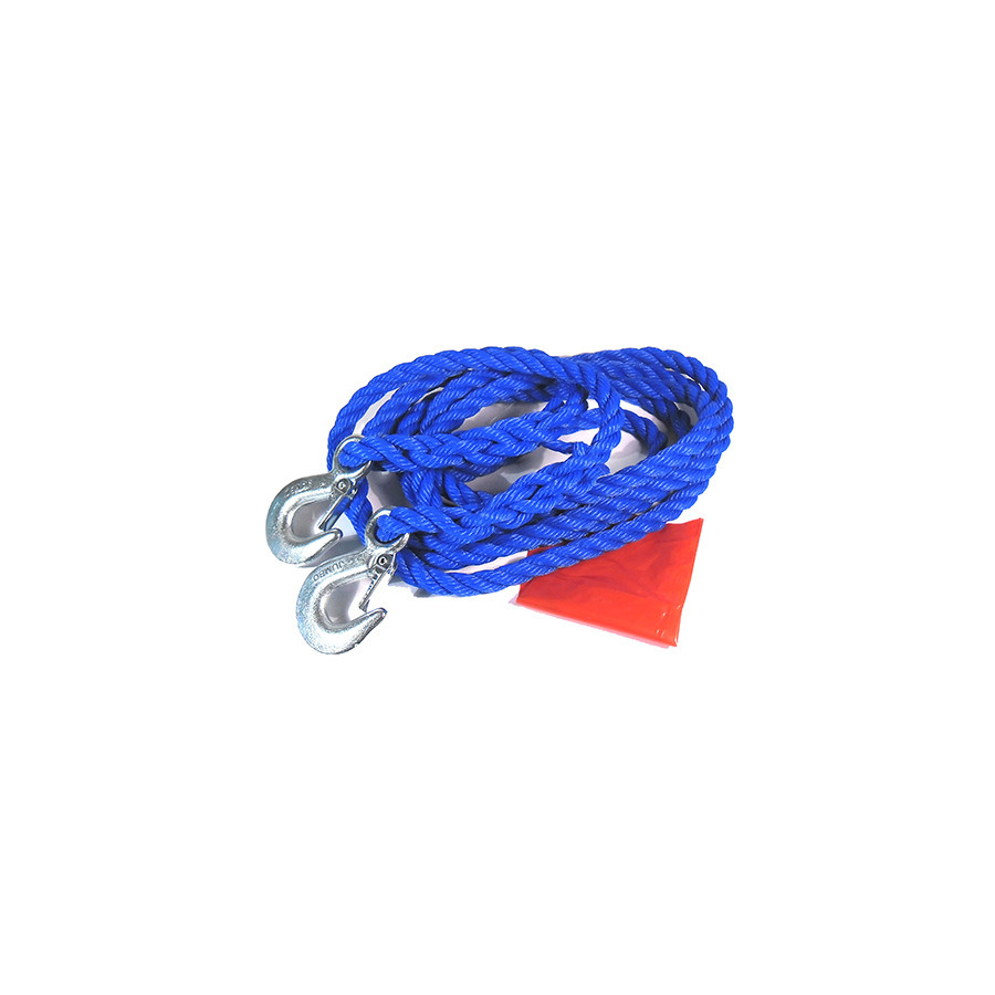 This is a TCP tow rope. The blue tow rope has a maximum towing capacity of 2500 kg and is four meters long. The tow rope features two strong hooks, making it very user-friendly.