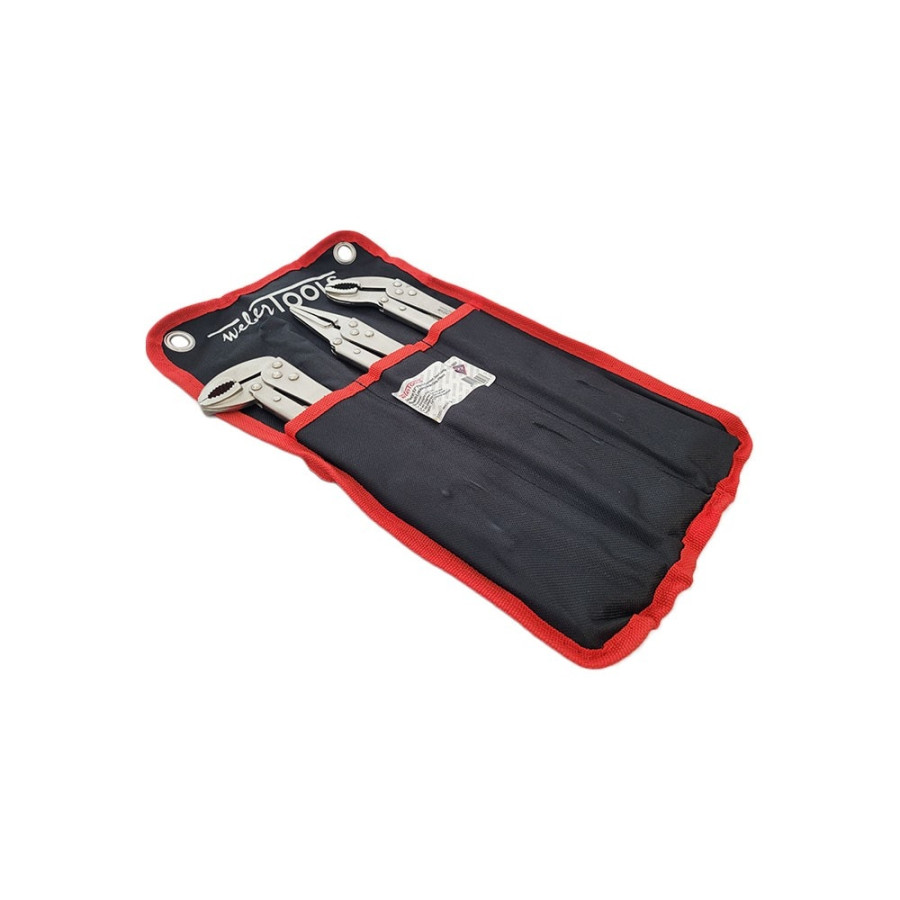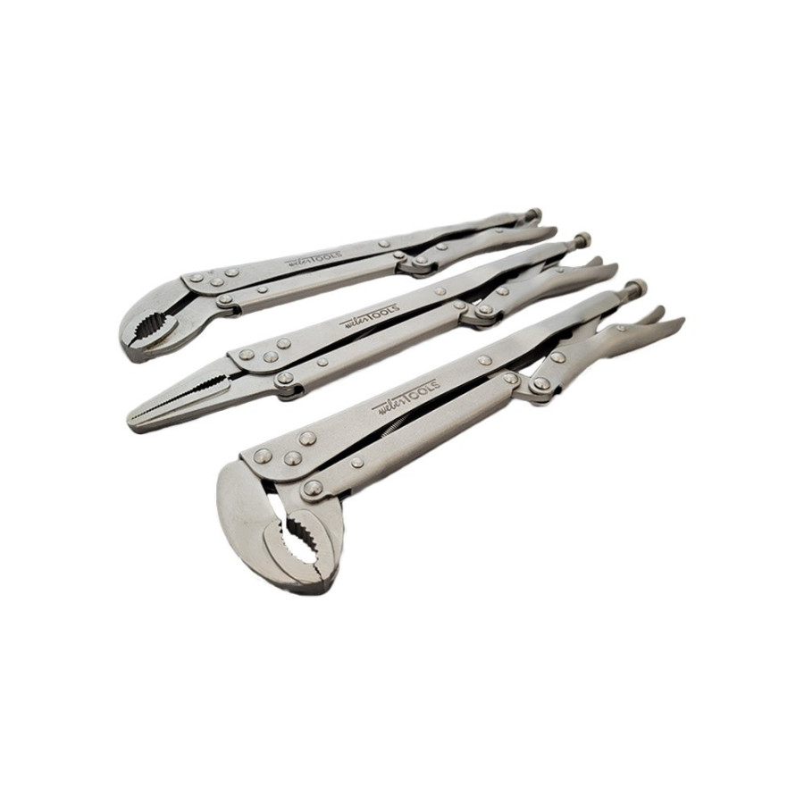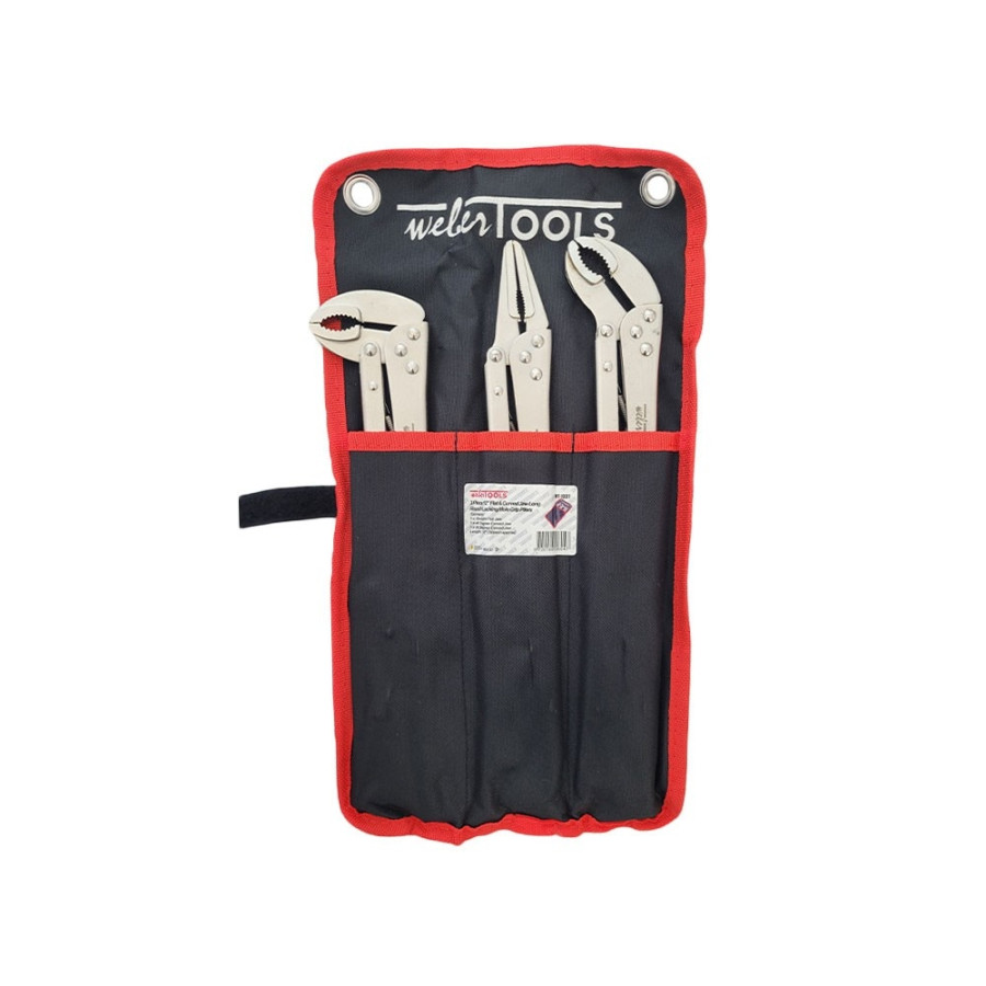 Discover our premium 3 piece locking pliers set, consisting of a straight pliers, a 40° angled pliers and an 80° angled pliers. Made from durable chrome vanadium steel, these pliers offer superior strength and resistance to wear, oxidation and corrosion. The set is supplied in a handy roll-up case, perfect for easy storage and transportation. An essential addition to any toolbox or workshop. Pliers have a length of 300mmL