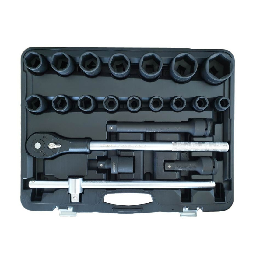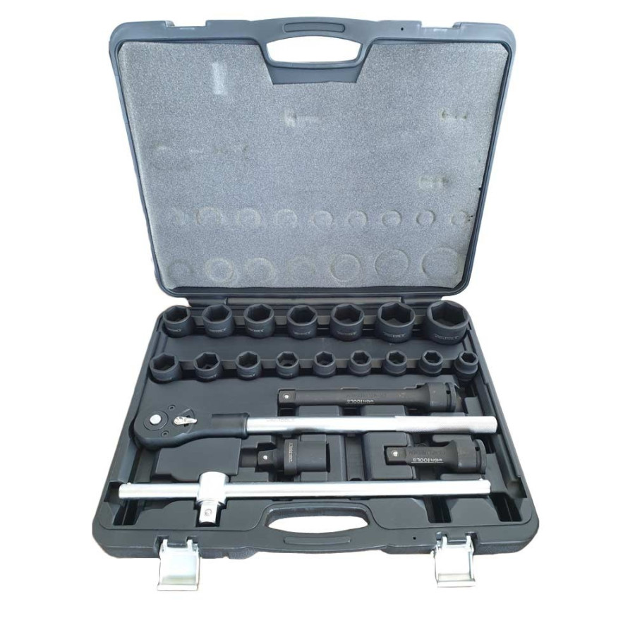 Professional set with indestructible 3/4" impact sockets, ratchet, extensions, knee joint and T-handle.