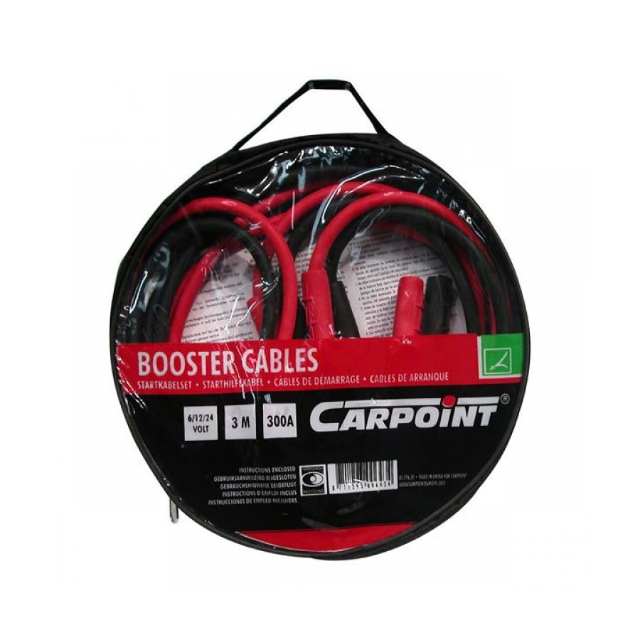 These Carpoint jumper cables are the solution if your car won't start due to a dead battery. Suitable for use with 6, 12, and 24-volt batteries. The jumper cables are color-coded (red and black) and are 3 meters long.