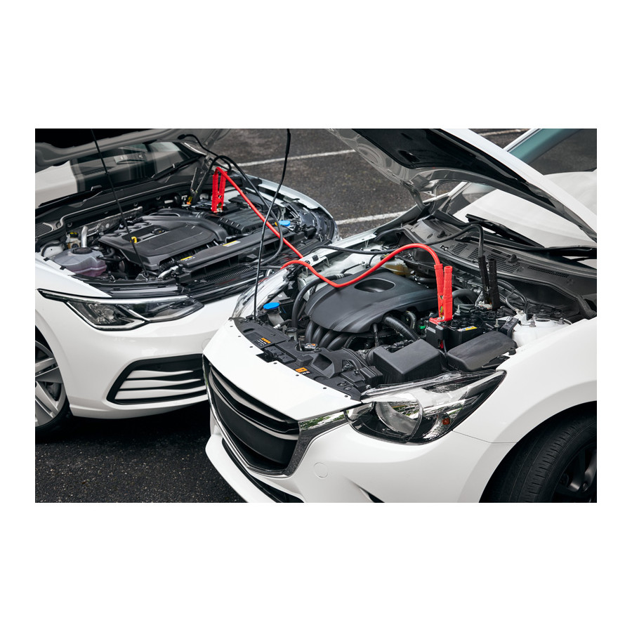 The different colours of the cables and the grips on the clamps reduce the risk of confusing the positive and negative clamps and thus the risk of an incorrect connection to the battery. The supplied storage bag allows the cables to be stored neatly and space-savingly. The operating instructions are also attached to the back of the storage bag and are therefore quickly accessible.
