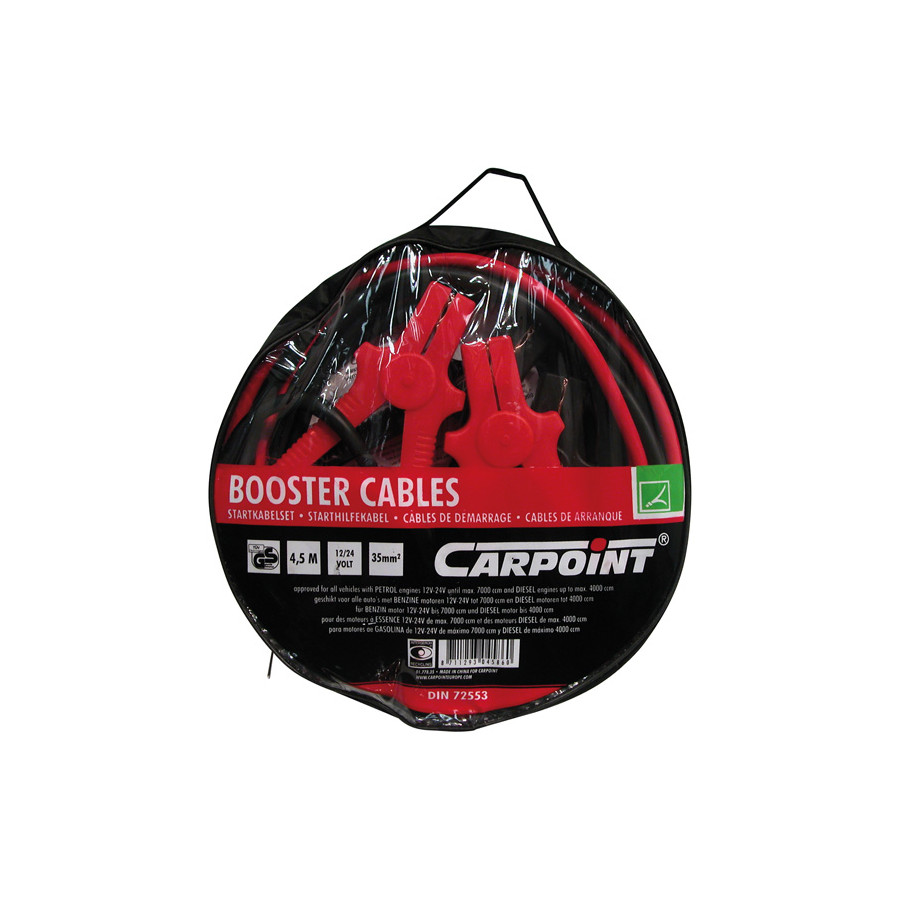 These Carpoint jumper cables are the solution if your car won't start due to a dead battery. Suitable for use with 12 and 24 volt batteries. The jumper cables are color-coded (red and black) and are 3.5 meters long. For gasoline cars with an engine displacement up to 2500cc. Cable thickness is 25mm² with fully insulated clamps and TÜV/GS product certification.