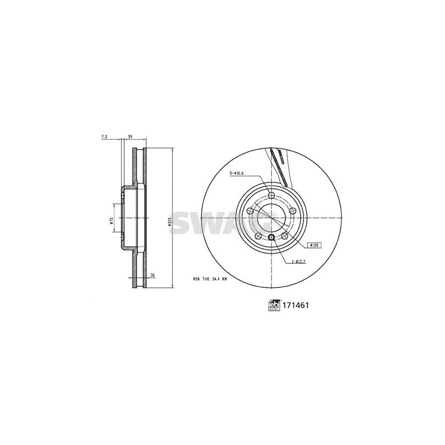 Outer diameter [mm] 374 Fitting Position Front axle right (driver's side) Rim Hole Number 5 Brake Disc Type Internal ventilation Surface Coated Number of mounting bores 1 Brake pads Exclusive Paired article numbers 33 10 5262 Bolt Hole Circle Ø [mm] 120 Centering Diameter [mm] 75 Machining High-carbon Warranty 2 years Thickness [mm] 66,3 Brake disc thickness (mm) 36 Minimum thickness (mm) 34,4 -