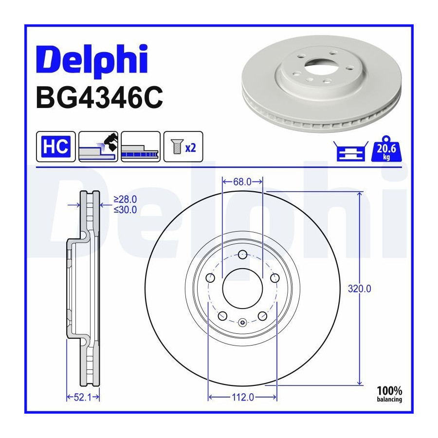 Outer diameter [mm] 320 Brake Disc Type Vented Surface Coated Number of Holes 5 Brake pads Exclusive Centering Diameter [mm] 68 Machining High-carbon Inspection Tag E1 90R-02C0343/1363 Warranty 2 years Height [mm] 52,1 Brake disc thickness (mm) 30 Minimum thickness (mm) 28 Similar products of other manufacturers