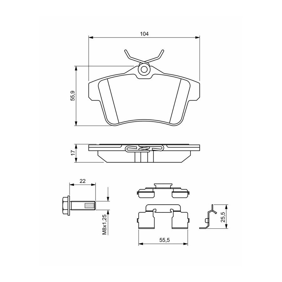 Wear Warning Contact Without wear indicator Content Set (4 brake pads per axle) Material Low-Metallic Supplementary Article/Info 2 With mounting manual With anti-squeak plate With screws Supplementary Article/Supplementary Info With accessories WVA Number 24922 Inspection Tag ECE-R90 Number of Springs 4 Number of screws 4 Warranty 2 years Height [mm] 55,9 Width [mm] 104 Thickness [mm] 17 Similar products of other manufacturers