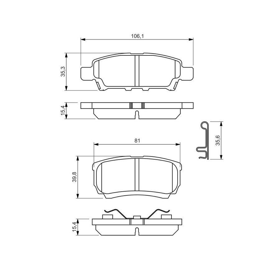 Wear Warning Contact With acoustic wear warning Width 1 [mm] 81 Width 2 [mm] 106,1 Content Set (4 brake pads per axle) Material Low-Metallic Supplementary Article/Info 2 With piston clip Part number of recommended accessories 1 987 474 257 1 987 474 463 1 987 474 428 WVA Number 24014 Inspection Tag ECE-R90 Warranty 2 years Thickness [mm] 15,4 Height 1 (mm) 35,3 Height 2 (mm) 39,8 Product must be determined by vehicle or engine Similar products of other manufacturers