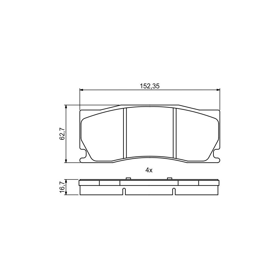 Wear Warning Contact Without wear indicator Content Set (4 brake pads per axle) Material Low-Metallic Supplementary Article/Info 2 With anti-squeak plate Part number of recommended accessories 1 987 474 306 1 987 474 514 1 987 474 513 WVA Number 24850 Inspection Tag ECE-R90 Warranty 2 years Height [mm] 62,7 Width [mm] 152,4 Thickness [mm] 16,34 Product must be determined by vehicle or engine Similar products of other manufacturers