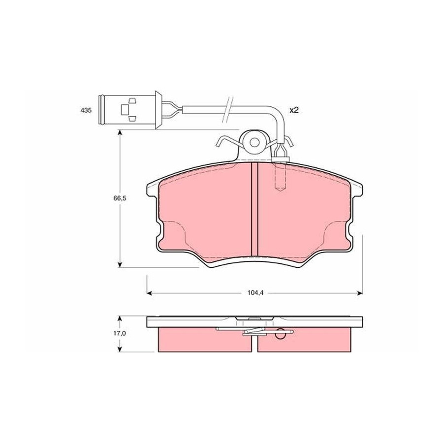 Wear Warning Contact Incl. wear warning contact Content Set (4 brake pads per axle) Assembly Front Supplementary Article/Info 2 With brake caliper screws Supplementary Article/Supplementary Info With accessories Manufacturer Restriction TRW Inspection Tag E1 90R 01024/108 Warranty 2 years Height [mm] 66,5 Width [mm] 104,4 Thickness [mm] 17 Similar products of other manufacturers