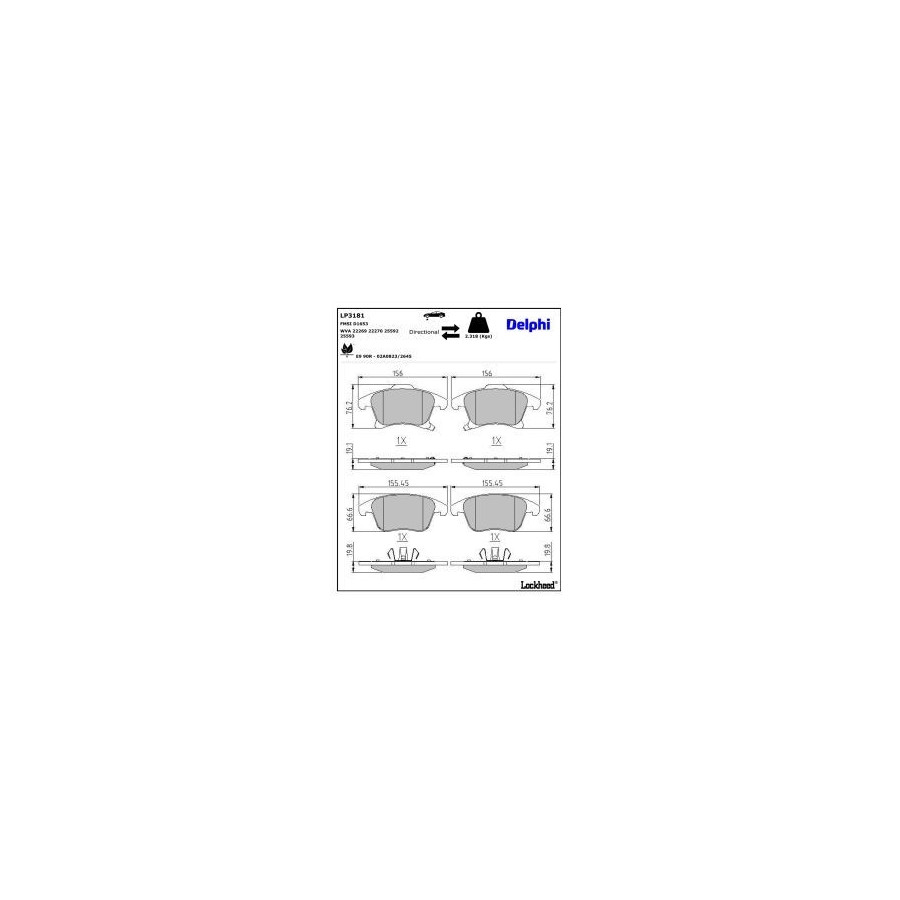 Manufacturer Manufacturer number Price A.B.S. 35078 AISIN BPFO-1031 ASAM 72622 ASHIKA 50-00-0311 ATE 13.0460-7313.2 ATE 13.0470-7313.2 BELACO BPD1435 BLUE PRINT ADF124208 BORG & BECK BBP2564 BOSCH 0 986 494 744 BOSCH 0 986 424 445 BOSCH 0 986 494 837 BRAXIS AB0693 BRAXIS AA0646 BRAXIS AA0564 BRAXIS AA0854 BRECK 22269 00 701 00 BREMBO P 24 211 BREMBO P 24 173 BREMSI BP3655 Brake ENGINEERING PA1975 CAR PNT7791 CHAMPION 573674CH CIFAM 822-1039-0 COMLINE CBP32286 DELPHI LP3181 (this product) DENCKERMANN B111546 DON PCP2149 Dr!ve+ DP1010.10.1096 EUROBRAKE 5502222586 FAI AutoParts BP297 FAI AutoParts FPBP530 FEBI BILSTEIN 16941 FERODO FDB4445 FREMAX FBP-0001 GALFER B1.G120-1580.2 HELLA 8DB 355 025-201 HERTH+BUSS JAKOPARTS J3600837 ICER 182231 JAPANPARTS PA-0311AF JAPKO 500311 JURATEK JCP8057 JURID 573674J KAMOKA JQ101447 Manufacturer Manufacturer number Price LORO 231-01-396 LPR 05P1977 LYNXauto BD-3037 MAGNETI MARELLI 363916061191 MAGNETI MARELLI 363700424173 MAGNETI MARELLI 363916060857 MAGNETI MARELLI 363700424211 MAPCO 6028HPS MAPCO 6028 MASTER-SPORT 13046120922N-SET-MSP MASTER-SPORT 13046120922N-SET-MS MAXGEAR 19-3406 METELLI 22-1039-0 METZGER 1170837 MEYLE 025 222 6920 MEYLE 025 222 6920/PD MINTEX MDB3826 MOTAQUIP LVXL1788 NATIONAL NP3261 NATIONAL NP2760 NK 222586 OPEN PARTS BPA1249.22 OPTIMAL BP-12948 OPTIMAL BP-12636 PAGID T2501N QUARO QP6007C QUARO QP6007 QUINTON HAZELL BP1865 R BRAKE RB2231 ROTINGER RT 2PD31810 ROTINGER RT 2PD31819HP SASIC 6216212 TEXTAR 2226901 TRISCAN 8110 16038 TRUSTING 1063.0 TRW GDB2092 VAICO V25-1776 VALEO 302717A VALEO 610419 VALEO 302717 VALEO 601522 VALEO 302511 fri.tech. 1063.0 -