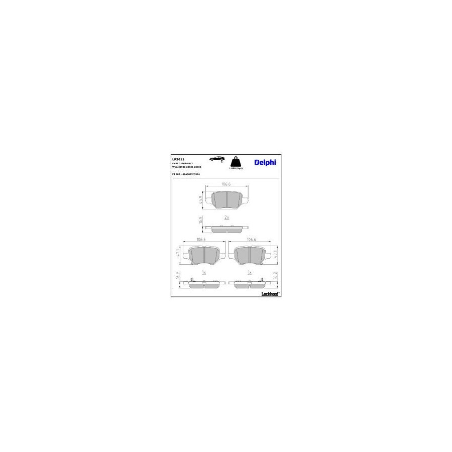 Manufacturer Manufacturer number Price A.B.S. 35236 AISIN BPPS-7014 ASHIKA 51-00-0405 ATE 13.0460-2638.2 ATE 13.0470-2638.2 BELACO BPD2453 BLUE PRINT ADBP420073 BOSCH 0 986 424 895 BRAXIS AA0783 BREMBO P 59 099 BREMSI BP3840 Brake ENGINEERING PA2386 CAR PNT7712 CIFAM 822-1213-0 COMLINE CBP32436 DELPHI LP3611 (this product) DENCKERMANN B111589 DON PCP1779 EUROBRAKE 5502223665 FEBI BILSTEIN 177073 FERODO FDB5215 FTE 9011252 GALFER B1.G120-1617.2 HELLA 8DB 355 040-181 ICER 182370 JAPANPARTS PP-0405AF JAPKO 510405 JURATEK JCP8562 JURID 573921J KAVO PARTS KBP-10138 Manufacturer Manufacturer number Price KRAFT AUTOMOTIVE 6011503 LPR 05P2177 MAGNETI MARELLI 363916061245 MAPCO 106111HPS MAPCO 106111 METELLI 22-1213-0 MEYLE 025 229 3017 MINTEX MDB4192 MOTAQUIP LVXL1990 NATIONAL NP3019 NK 223665 NPS O361L01 OPEN PARTS BPA1810.02 OPTIMAL BP-12814 PAGID T4185N QUARO QP0148 QUARO QP0148C QUINTON HAZELL BP1975 R BRAKE RB2370 RAICAM RA.1257.0 ROTINGER RT 1PD36110 SASIC 6210119 SKF VKBP 91326 A SWAG 33 10 3880 TEXTAR 2293001 TOPRAN 209 322 TRUSTING 1213.0 TRW GDB2406 fri.tech. 1213.0 -