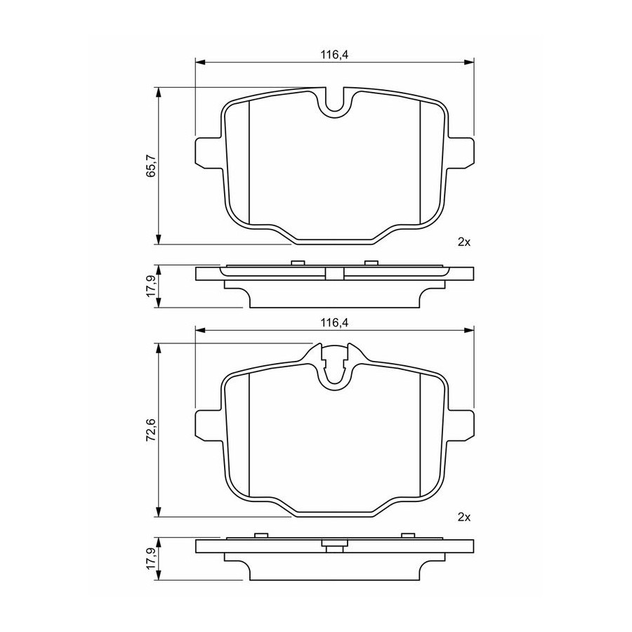 Wear Warning Contact Without wear indicator Content Set (4 brake pads per axle) Material Low-Metallic Supplementary Article/Info 2 With anti-squeak plate Part number of recommended accessories 1 987 473 509 1 987 474 549 1 987 474 548 1 987 473 615 WVA Number 24704 Inspection Tag ECE-R90 Number of screws 4 Warranty 2 years Width [mm] 116 Thickness [mm] 17,7 Height 1 (mm) 65,5 Height 2 (mm) 72,4 Product must be determined by vehicle or engine Similar products of other manufacturers