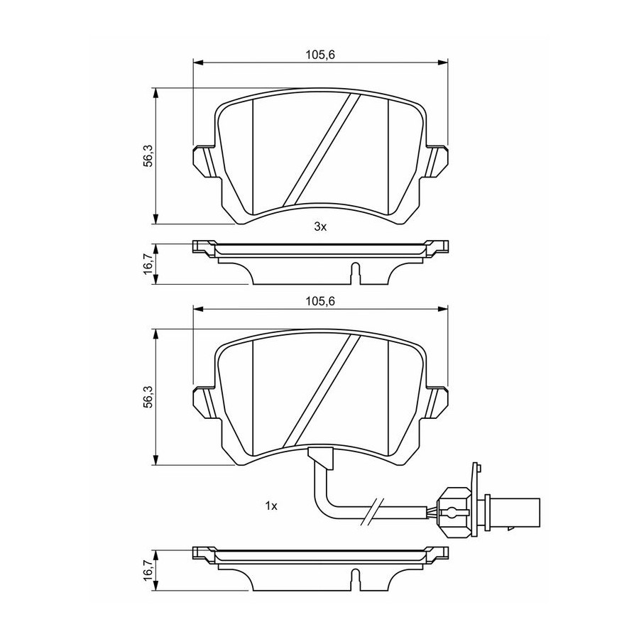Wear Warning Contact With integrated wear sensor Content Set (4 brake pads per axle) Material Low-Metallic Supplementary Article/Info 2 With anti-squeak plate Part number of recommended accessories 1 987 474 685 WVA Number 22186 Inspection Tag ECE-R90 Warranty 2 years Height [mm] 56,3 Width [mm] 105,6 Thickness [mm] 16,7 Product must be determined by vehicle or engine Similar products of other manufacturers