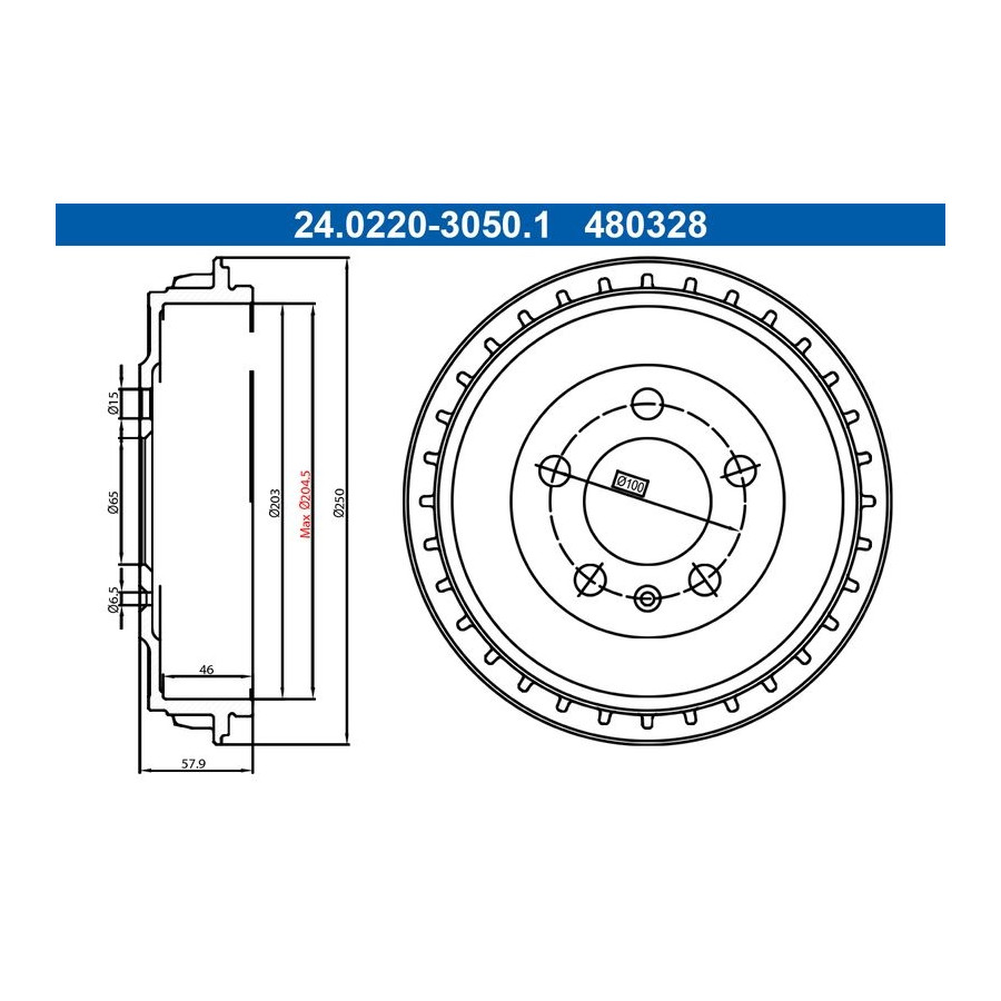 Number of Holes 5 Bolt Hole Circle Ø [mm] 100,0 Support plate diameter [mm] 65,0 Inspection Tag E1 90R-02D0324/1876 MAPP code available Warranty 2 years Brake drum diameter outside [mm] 250,0 Brake drum diameter inside [mm] 203,0 Hole diameter [mm] 15,6 Brake drum height total [mm] 57,9 Internal brake drum height [mm] 46,0 max. brake drum turn-out size [mm] 204,5 Similar products of other manufacturers