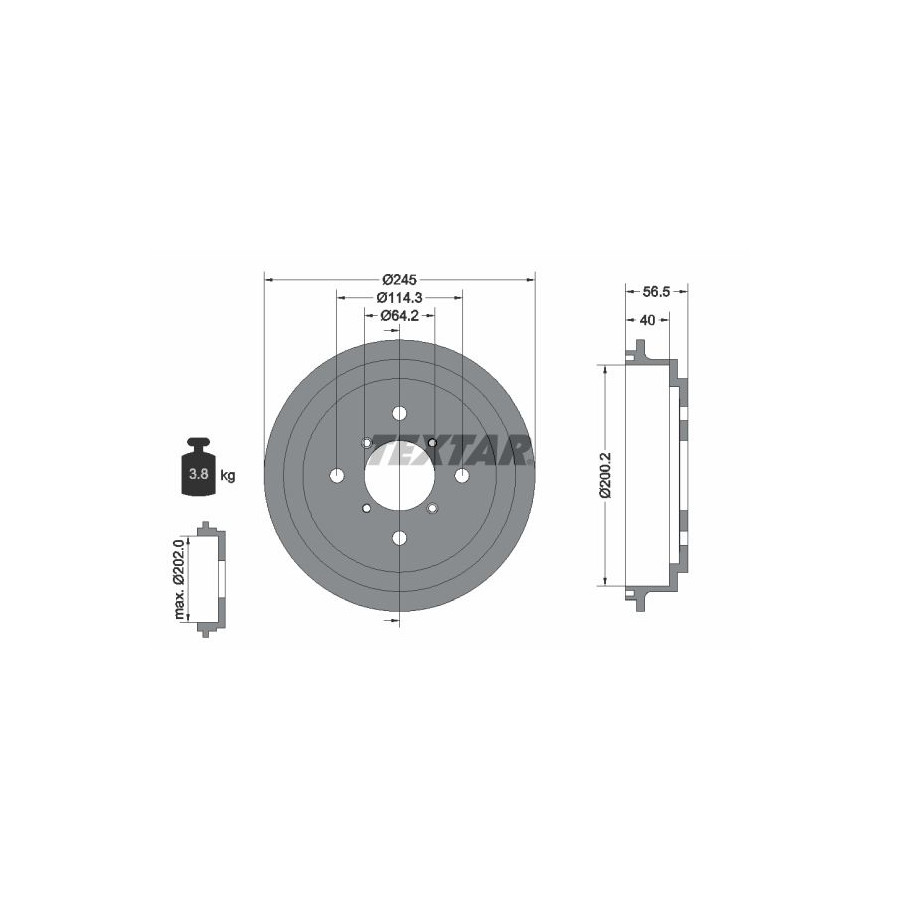 Supplementary Article/Info 2 Without wheel hub Without wheel studs Without wheel bearing Bolt Hole Circle Ø [mm] 114,3 Centering Diameter [mm] 64 Hole Arrangement / Number 04/08 Packaging length [cm] 26,3 Packaging width [cm] 25,9 Packaging height [cm] 8,6 Warranty 2 years Brake drum diameter outside [mm] 245 Brake drum diameter inside [mm] 200 Weight [kg] 3,8 Hole diameter for wheel bolt [inch] 13 Brake drum height total [mm] 57 Internal brake drum height [mm] 40 max. brake drum turn-out size [mm] 202 Similar products of other manufacturers