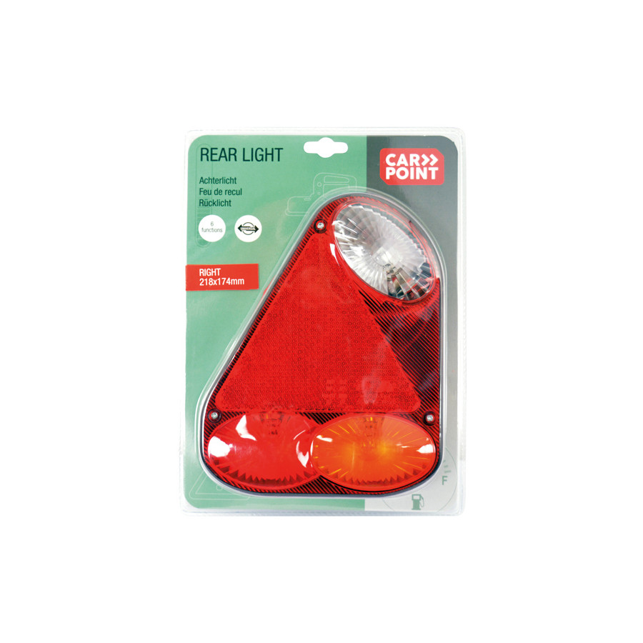 High-quality Carpoint 12 Volt rear light in a sturdy plastic housing with E-mark and functions. Suitable for right rear of a trailer. With screw fixing and a center distance of 150mm. Connecting the rear light is possible with the five pre-assembled connecting wires.