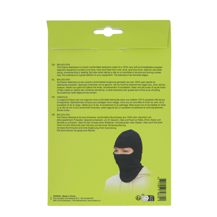 The Dresco Balaclava is a comfortable black balaclava made of 100% ultra-soft and breathable polyester. Specially designed to protect your face, neck, and head from the cold, wind, dust, and snow. Ideal for skiing, snowboarding, or ice skating. It's also a great addition to your gear when you're out on your motorcycle or bicycle, or during a winter hike.