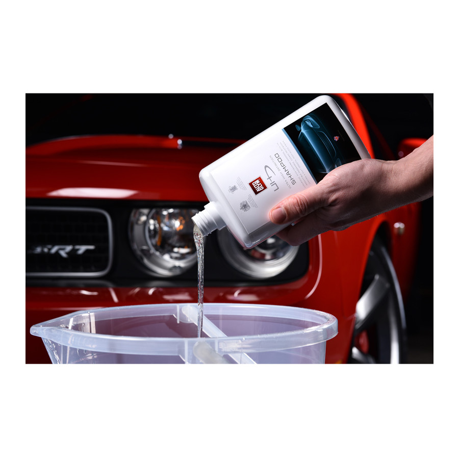 Luxurious, richly foaming shampoo with an irresistible fragrance. Cleans your paintwork with a silky smooth high gloss as end result. It not only foams generously in the bucket, but also on the car, the foam retains longer on the body, so that the dirt soaks off better and you cannot skip places. With the new Ultra High Definition Shampoo you slide as it were on the body as you have never experienced before. The completely new pH neutral composition effortlessly removes dirt and traffic dirt and gives a high-gloss finish and a super smooth surface.