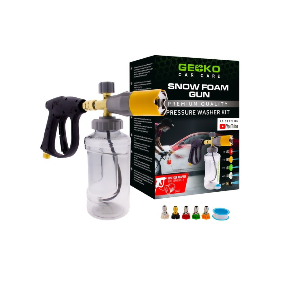 The Gecko Snow Foam Gun is the ultimate choice for anyone who wants to thoroughly clean their car with a powerful layer of snow foam. This pressure washer-compatible foam gun is designed to evenly distribute a thick layer of snow foam over your car. The combination of the pressure washer, foam gun, and Gecko Snow Foam ensures your car is completely covered in foam, making it the perfect pre-wash before you begin washing and detailing.