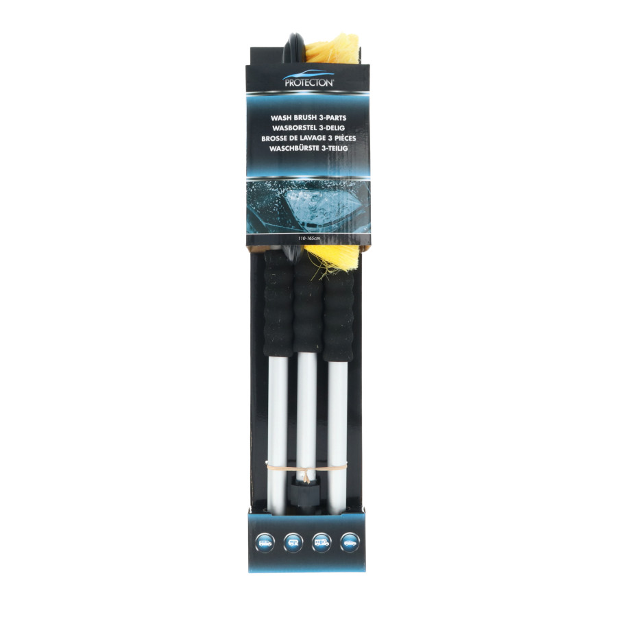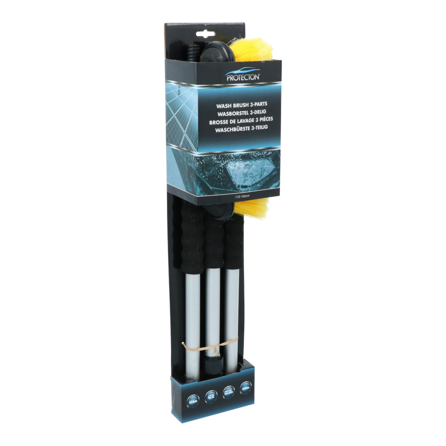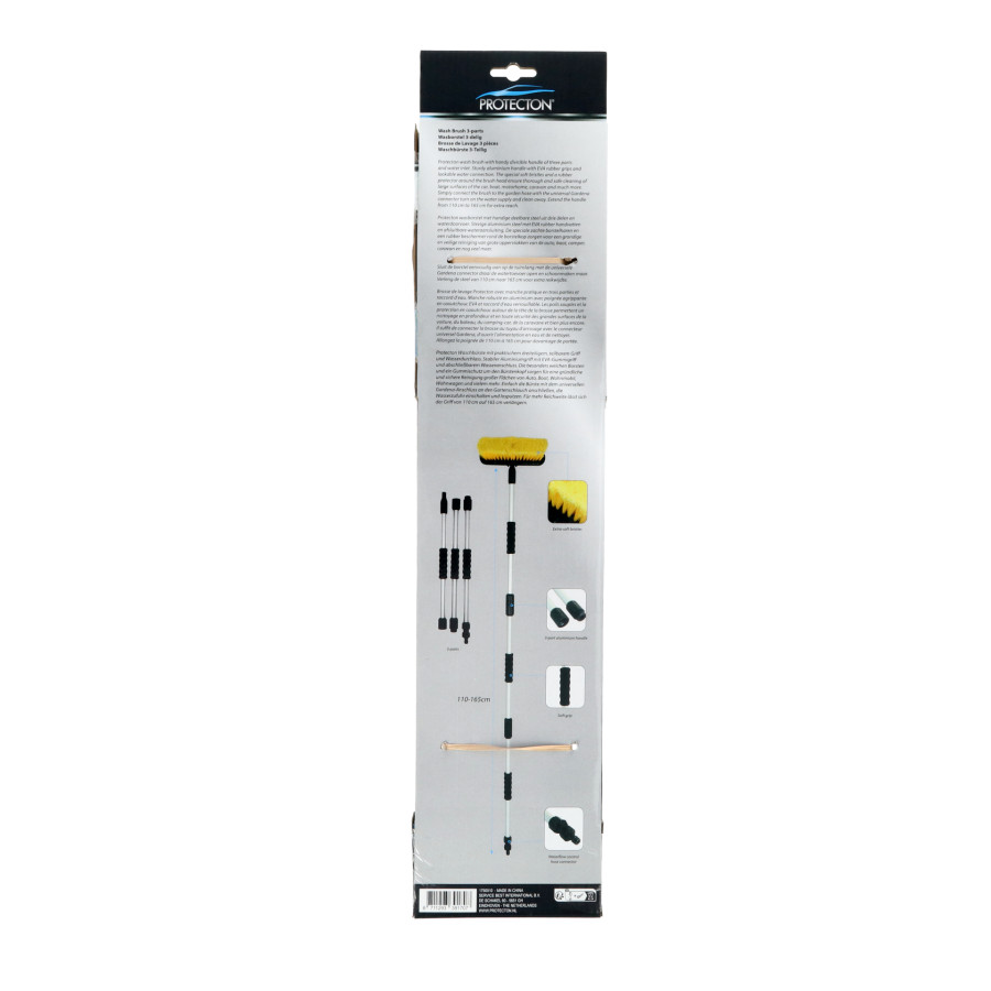 Protecton washing brush with handy divisible handle in three parts and water passage. Sturdy aluminum handle with EVA rubber handles and lockable water connection. The special soft bristles and a rubber protector around the brush head ensure thorough and safe cleaning of large surfaces of the car, boat, camper, caravan and much more.