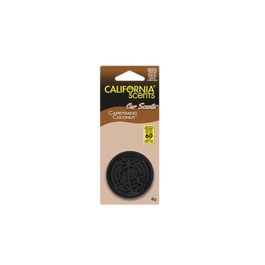 California Scents Air Freshener with Capistrano Coconut scent. Each tin contains three pillows filled with a 100% natural fragrance. The tin comes with a vented lid. Open the lid gradually to distribute the fragrance as desired. 100% organic and biodegradable. Provides fragrance for up to 60 days. Ideal for the car, home, office, etc.