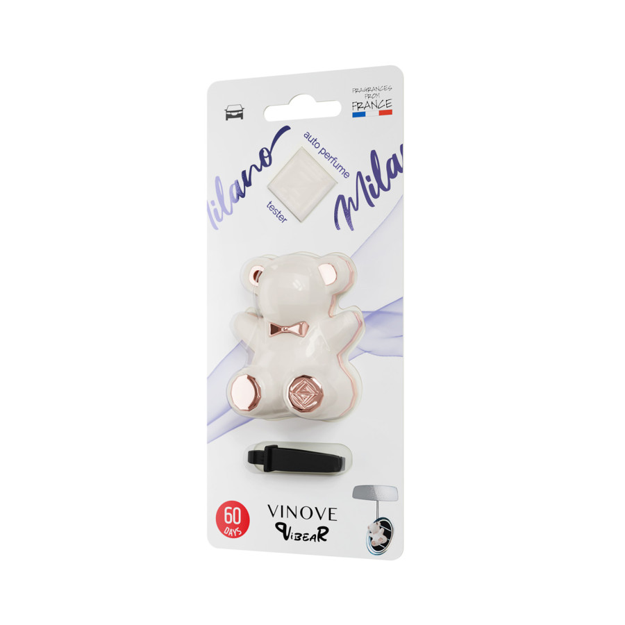 Vinove air freshener Vibear Milano a unique combination of brown colored polymer in the shape of a teddy bear. With a scent of cardamom with a hint of hot pepper and fresh sage, pineapple and chestnut. The air freshener can be hung in the car on the rear-view mirror or placed horizontally or vertically in the ventilation grille with the clip.