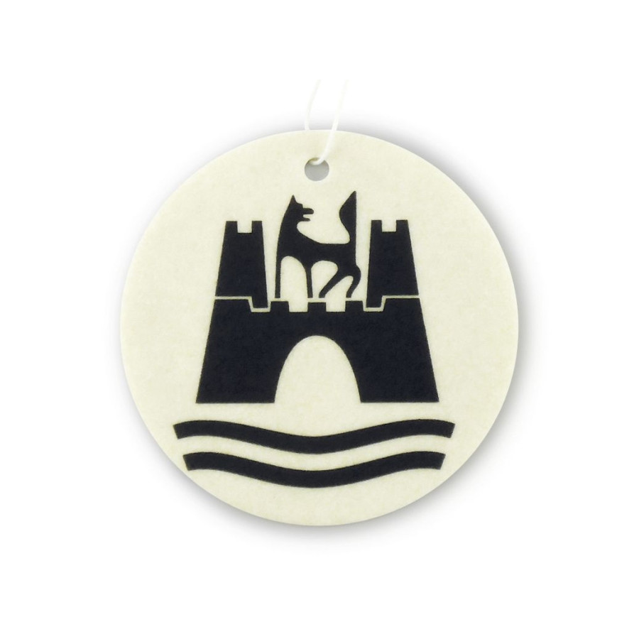 This unique air freshener with the VW logo on the front and the city emblem for Wolfsburg (VW headquarters in Germany) on the back.