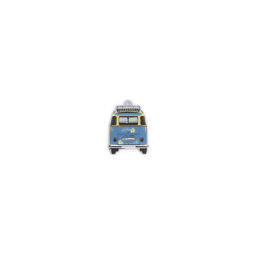 This unique air freshener features a turquoise design of the front and back of the legendary VW T1 Bus.