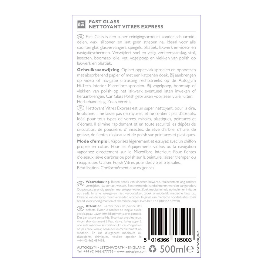 Due to the formula in Autoglym Fast Glass, this cleaner is especially recommended for use on acrylic, Perspex and plastic windows and the rear windows of convertibles.