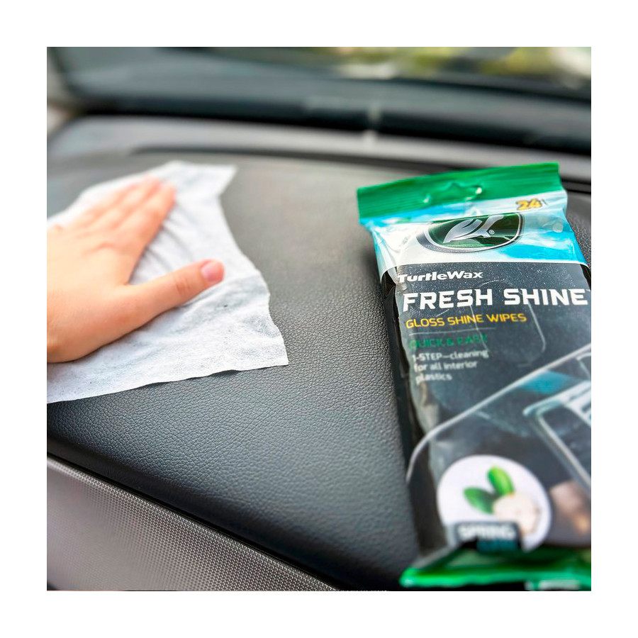 Turtle Wax Fresh Shine Spring Fresh Gloss Wipes provide quick and easy one-step cleaning for all interior plastics. Use the multipurpose wipes on hard surfaces such as dashboards, instrument panels, door trims, sills, and both hard driver's and passenger seats. Treated surfaces dry to a gloss finish, with a long-lasting anti-static shield that repels dust and dirt. The wipes release a delightful Spring Clean scent. 24 wipes in a resealable package to maintain moisture.