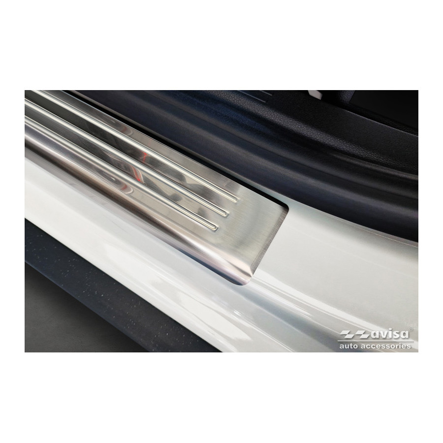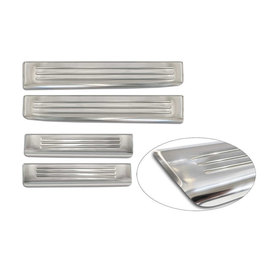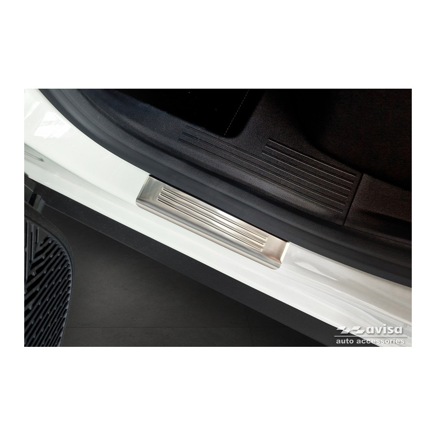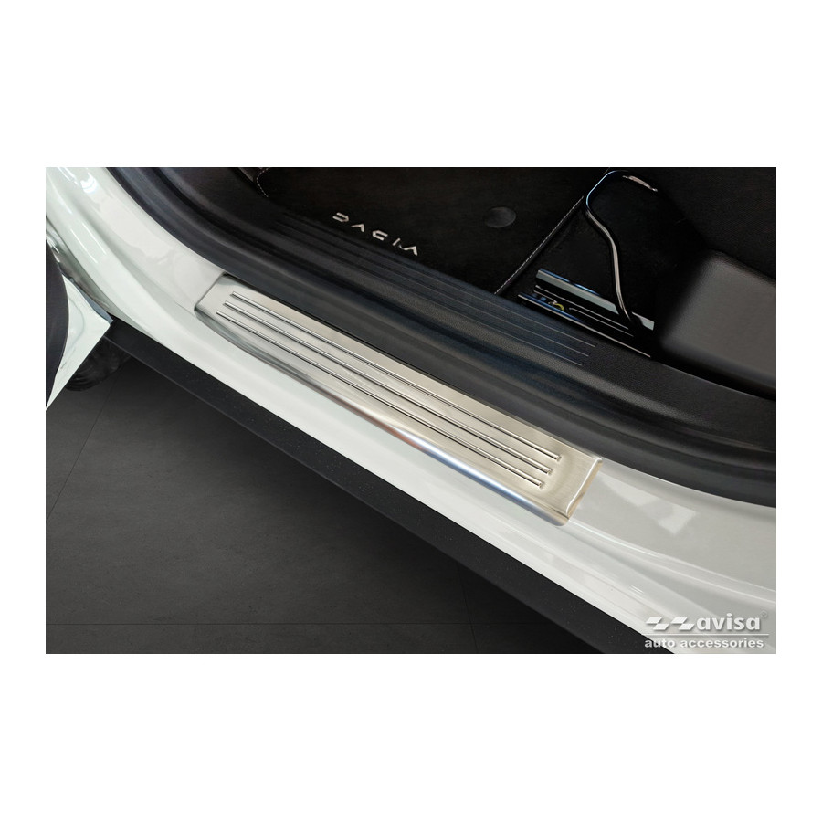 Stainless steel door sill moldings suitable for Dacia Duster III 2024- 'Lines' - set of 4. Door sill moldings are the ultimate accessories for protecting your car's sills and giving them a luxurious look. These are custom-made for your car, guaranteeing a perfect fit. They prevent scratches and damage while getting in and out and protect against the elements. With a wide selection of materials and designs, you can give your car a unique look. These door sill moldings are easy to attach with the included 3M tape.