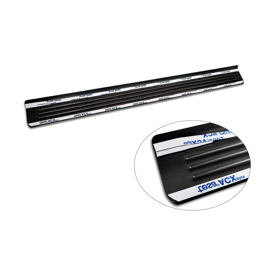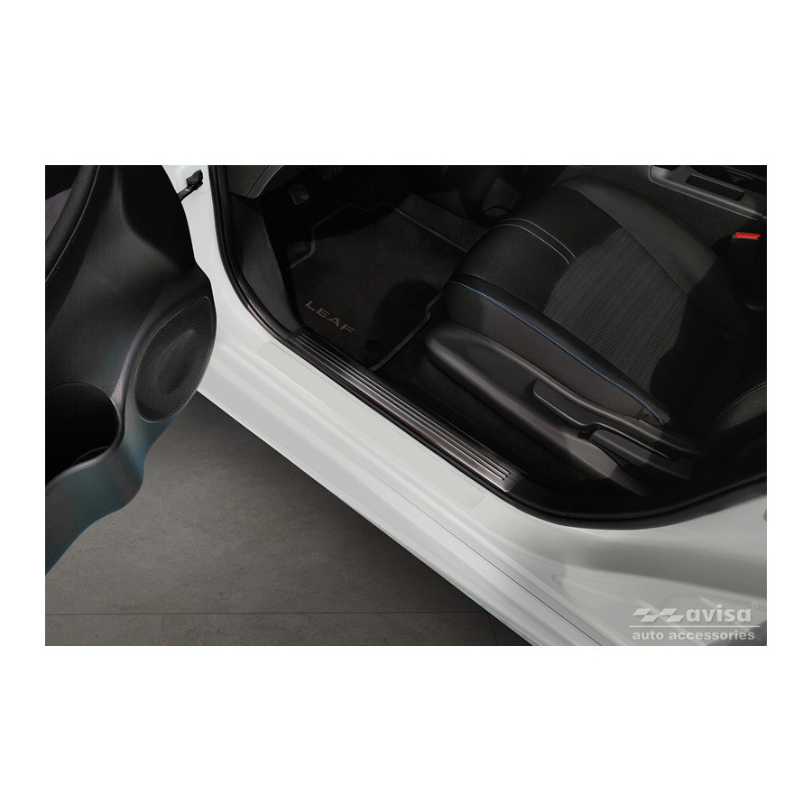 Black Stainless Steel Door Sill Trims Suitable for Nissan Leaf II 2017- - 'Lines' - Set of 4. Door sill trims are the ultimate accessories for protecting your car's sills and adding a luxurious look. These are custom-made for your car, ensuring a perfect fit. They prevent scratches and damage while getting in and out and protect against the elements. With a wide selection of materials and designs, you can give your car a unique look. These door sill trims are easy to attach with the included 3M tape. Specifications: Additional Information: Die-cut lines. Contents: Set of 4 for both front and rear doors. Color: Black. Material: Stainless steel.