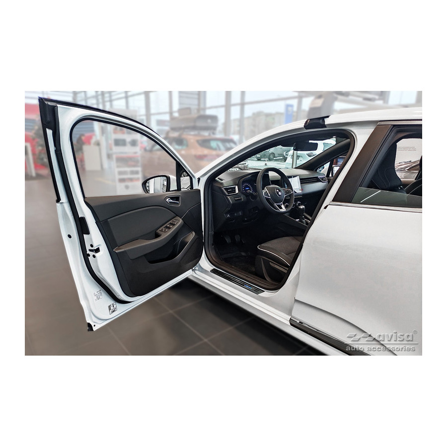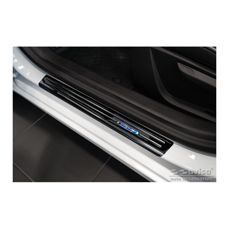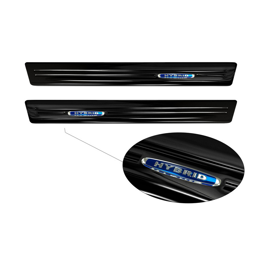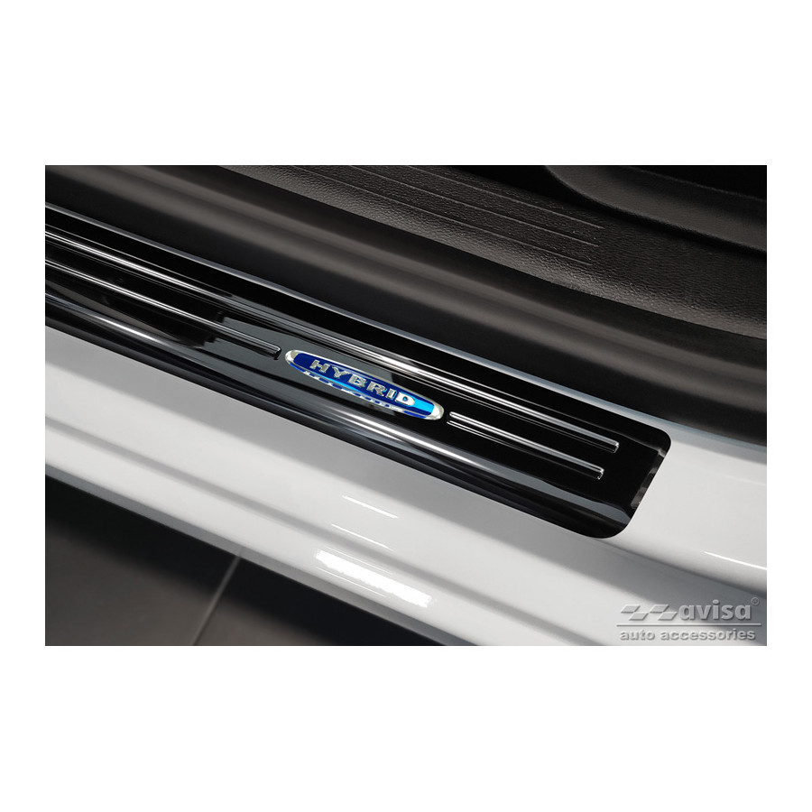 Black Stainless Steel Door Sill Trims Suitable for Renault Clio V 2019- 'Hybrid' - 2-Piece Set. Door sill trims are the ultimate accessories for protecting your car's sills and adding a luxurious look. These are custom-made for your car, ensuring a perfect fit. They prevent scratches and damage while getting in and out and protect against the elements. With a wide selection of materials and designs, you can give your car a unique look. These door sill trims are easy to attach with the included 3M tape. Specifications: Additional Information: Die-cut lines and blue printed 'Hybrid' logo. Contents: 2-piece set for front doors. Color: Black. Material: Stainless steel.