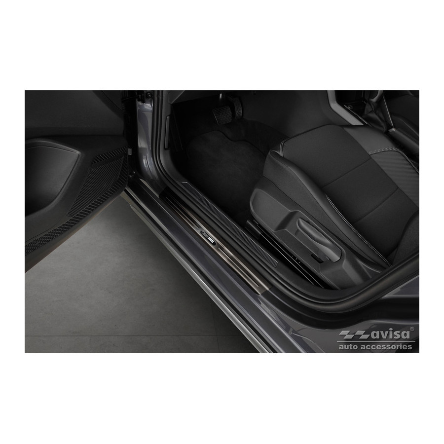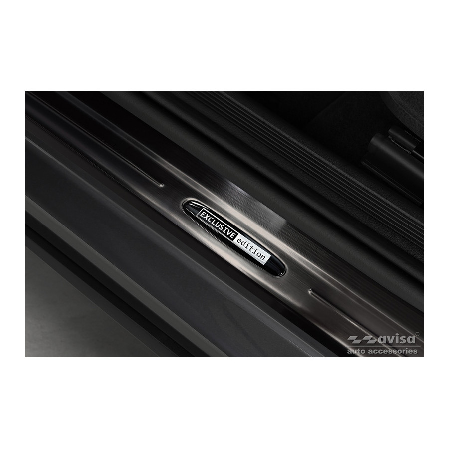 Black Stainless Steel Door Sill Trims Suitable for Volkswagen Taigo 2021 - 'Exclusive Edition' - Set of 4. Door sill trims are the ultimate accessories to protect your car's sills and give them a luxurious look. These are custom-made for your car, guaranteeing a perfect fit. They prevent scratches and damage while getting in and out and protect against the elements. With a wide choice of materials and designs, you can give your car a unique look. These door sill trims are easy to attach with the included 3M tape. Specifications: Additional information: Stamped lines and 'Exclusive Edition' logo. Contents: Set of 4 for both front and rear doors.