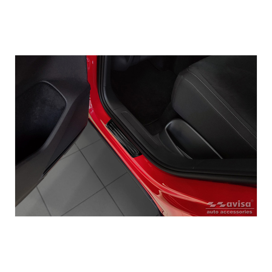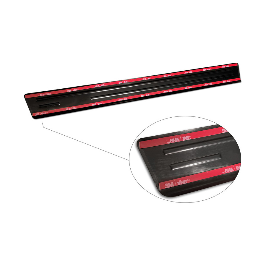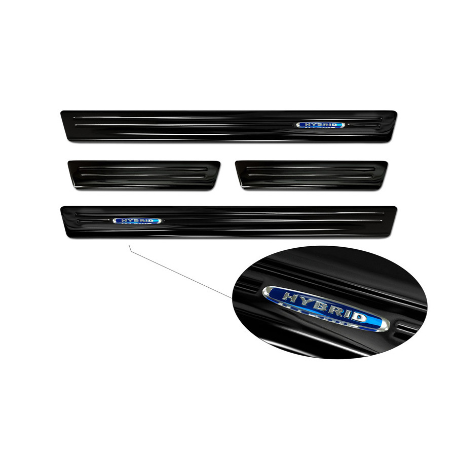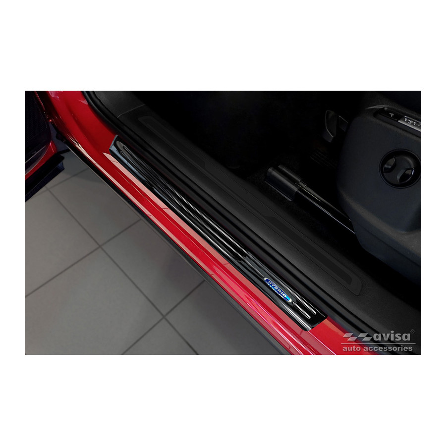 Black Stainless Steel Door Sill Trims Suitable for Volkswagen Tiguan II 2016-2020 & FL 2020- 'Hybrid' - Set of 4. Door sill trims are the ultimate accessories for protecting your car's sills and giving them a luxurious look. These are custom-made for your car, guaranteeing a perfect fit. They prevent scratches and damage while getting in and out and protect against the elements. With a wide choice of materials and designs, you can give your car a unique look. These door sill trims are easy to attach with the included 3M tape. Specifications: Die-cut lines and blue printed 'Hybrid' logo. Contents: Set of 4 for both front and rear doors. Color: Black. Material: Stainless steel.
